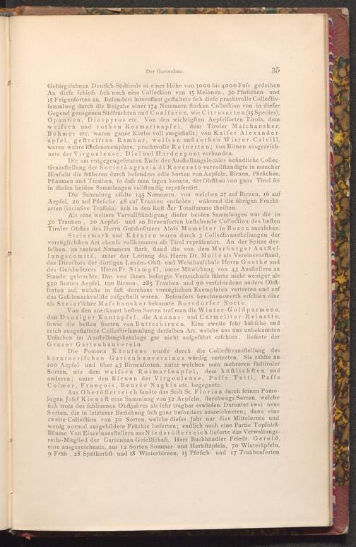 Die Pomona Kärntens wurde durch die Collectivausftellung des kärntnerifchen Gartenbauvereines würdig vertreten. Sie zählte an 100 Aepfel- und über 43 Birnenforten, unter welchen man mehreren füdtiroler Sorten, wie dem weifsen Rosmarinapfel, dem köftlichften und anderen; unter den Birnen der Virgouleuse, Paffa Tutti, Paffa Colmar, François, Beurée Naghin etc. begegnete.