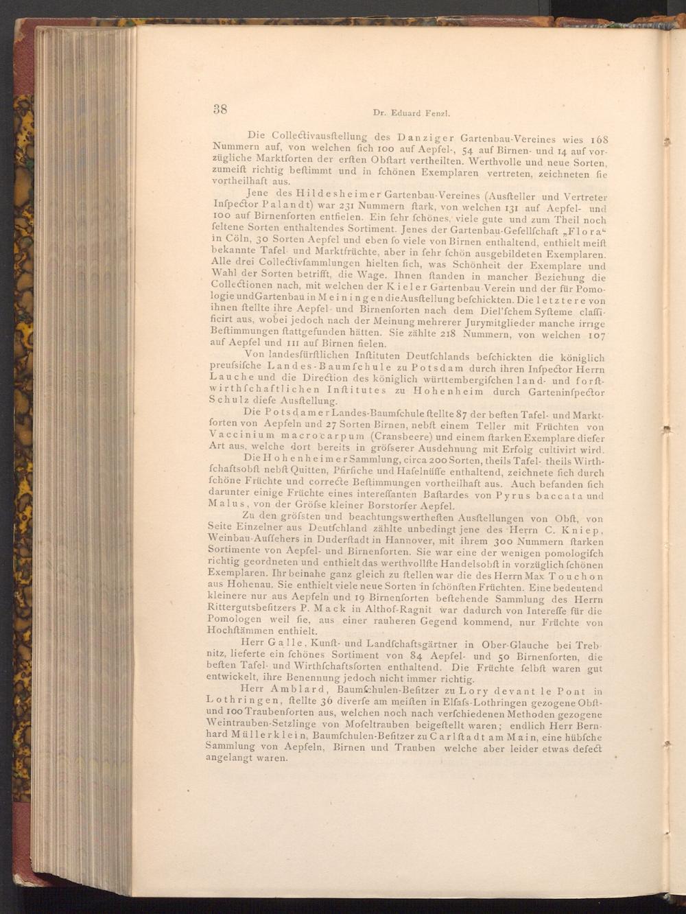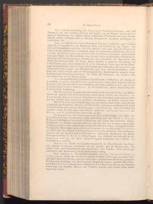 Herr Amblard, Baumfchulen- Befitzer zu Lory devant le Pont in Lothringen, ftellte 36 diverfe am meiſten in Elfafs- Lothringen gezogene Obftund 100 Traubenforten aus, welchen noch nach verfchiedenen Methoden gezogene Weintrauben- Setzlinge von Mofeltrauben beigeftellt waren; endlich Herr Bernhard Müllerklein, Baumfchulen- Befitzer zu Carlftadt am Main, eine hübfche Sammlung von Aepfeln, Birnen und Trauben welche aber leider etwas defect angelangt waren.