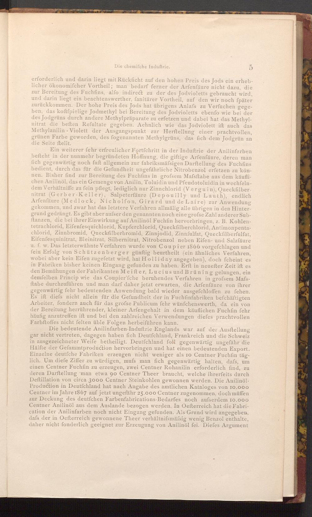 Die bedeutende Anilinfarben- Induftrie Englands war auf der Ausftellung gar nicht vertreten, dagegen haben fich Deutfchland, Frankreich und die Schweiz in ausgezeichneter Weife betheiligt. Deutfchland foll gegenwärtig ungefähr die Hälfte der Gefammtproduction hervorbringen und hat einen bedeutenden Export. Einzelne deutfche Fabriken erzeugen nicht weniger als 10 Centner Fuchfin täglich. Um diefe Ziffer zu würdigen, mufs man fich gegenwärtig halten, daſs, um einen Centner Fuchfin zu erzeugen, zwei Centner Rohanilin erforderlich find, zu deren Darftellung man etwa 90 Centner Theer braucht, welche ihrerfeits durch Deftillation von circa 3000 Centner Steinkohlen gewonnen werden. Die AnilinölProduction in Deutfchland hat nach Angabe des amtlichen Kataloges von 10.000 Centner im Jahre 1867 auf jetzt ungefähr 25.000 Centner zugenommen, doch müffen zur Deckung des deutfchen Farbenfabrications- Bedarfes noch aufserdem 10.000 Centner Anilinöl aus dem Auslande bezogen werden. In Oefterreich hat die Fabrication der Anilinfarben noch nicht Eingang gefunden. Als Grund wird angegeben, dafs der in Oefterreich gewonnene Theer verhältnifsmäfsig wenig Benzol enthalte, daher nicht fonderlich geeignet zur Erzeugung von Anilinöl fei. Diefes Argument