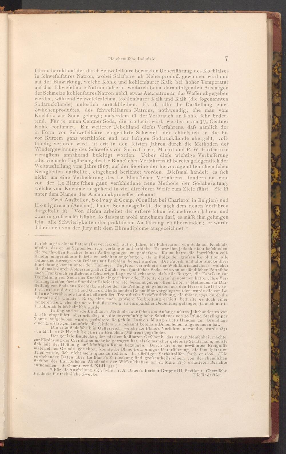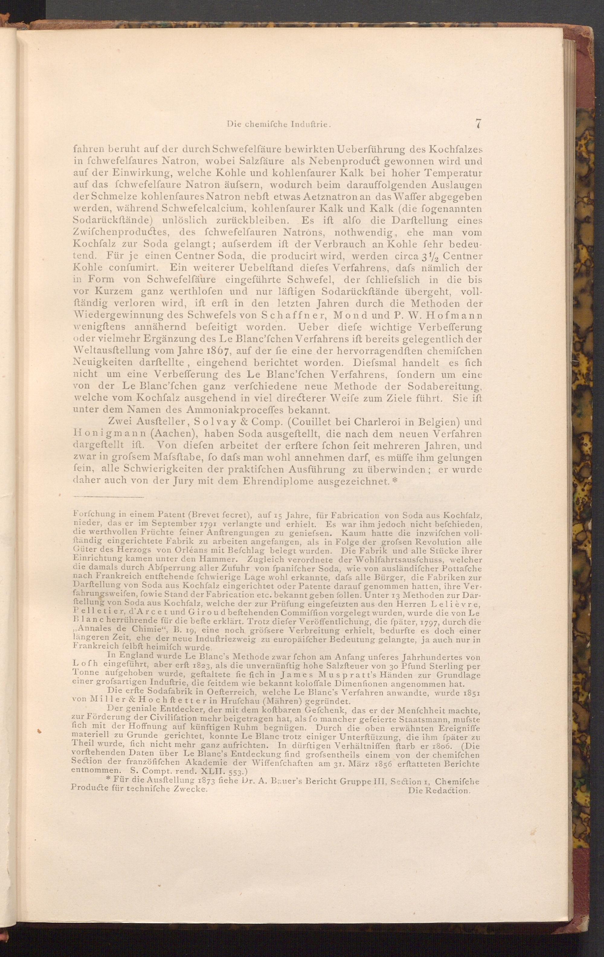 In England wurde Le Blanc's Methode zwar fchon am Anfang unferes Jahrhundertes von Lofh eingeführt, aber erft 1823, als die unvernünftig hohe Salzfteuer von 30 Pfund Sterling per Tonne aufgehoben wurde, geftaltete fie fich in James Muspratt's Händen zur Grundlage einer grofsartigen Induftrie, die feitdem wie bekannt koloffale Dimenfionen angenommen hat.
