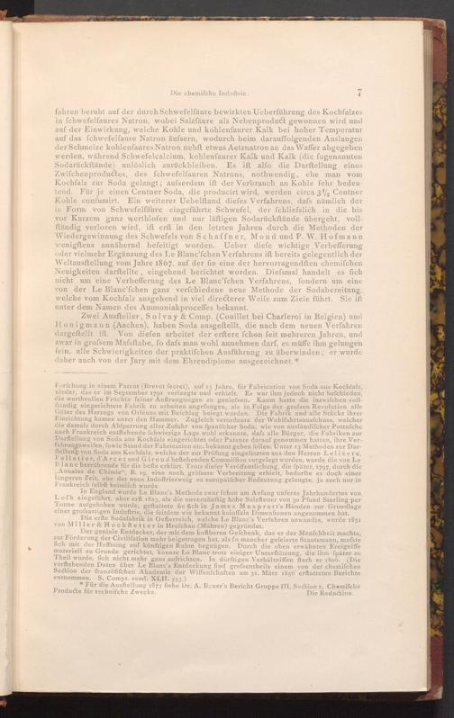 Zwei Ausfteller, Solvay& Comp.( Couillet bei Charleroi in Belgien) und Honigmann( Aachen), haben Soda ausgeftellt, die nach dem neuen Verfahren dargestellt ift. Von diefen arbeitet der erftere fchon feit mehreren Jahren, und zwar in grofsem Mafsftabe, fo dafs man wohl annehmen darf, es müffe ihm gelungen fein, alle Schwierigkeiten der praktifchen Ausführung zu überwinden; er wurde daher auch von der Jury mit dem Ehrendiplome ausgezeichnet.*
