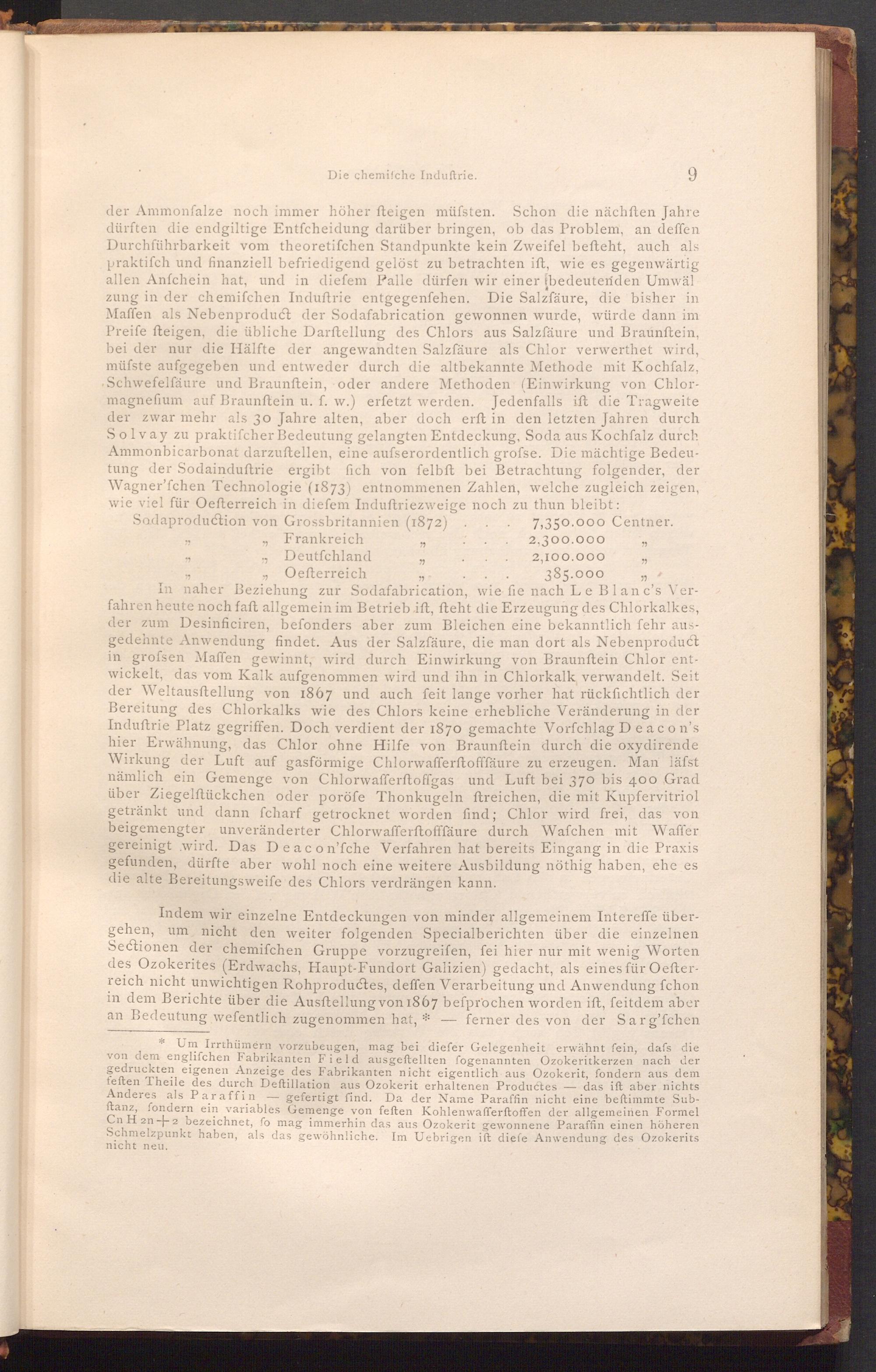 der Ammonfalze noch immer höher fteigen müfsten. Schon die nächften Jahre dürften die endgiltige Entfcheidung darüber bringen, ob das Problem, an deffen Durchführbarkeit vom theoretifchen Standpunkte kein Zweifel befteht, auch als praktiſch und finanziell befriedigend gelöst zu betrachten ift, wie es gegenwärtig allen Anfchein hat, und in diefem Palle dürfen wir einer bedeutenden Umwäl zung in der chemifchen Induſtrie entgegenfehen. Die Salzfäure, die bisher in Maffen als Nebenproduct der Sodafabrication gewonnen wurde, würde dann im Preife fteigen, die übliche Darftellung des Chlors aus Salzfäure und Braunftein, bei der nur die Hälfte der angewandten Salzfäure als Chlor verwerthet wird, müfste aufgegeben und entweder durch die altbekannte Methode mit Kochfalz, Schwefelfäure und Braunftein, oder andere Methoden( Einwirkung von Chlormagneſium auf Braunftein u. f. w.) erfetzt werden. Jedenfalls ift die Tragweite der zwar mehr als 30 Jahre alten, aber doch erft in den letzten Jahren durch Solvay zu praktifcher Bedeutung gelangten Entdeckung, Soda aus Kochfalz durch Ammonbicarbonat darzuftellen, eine aufserordentlich grofse. Die mächtige Bedeutung der Sodainduftrie ergibt fich von felbft bei Betrachtung folgender, der Wagner'fchen Technologie( 1873) entnommenen Zahlen, welche zugleich zeigen, wie viel für Oefterreich in diefem Induftriezweige noch zu thun bleibt: Sodaproduction von Grossbritannien( 1872)