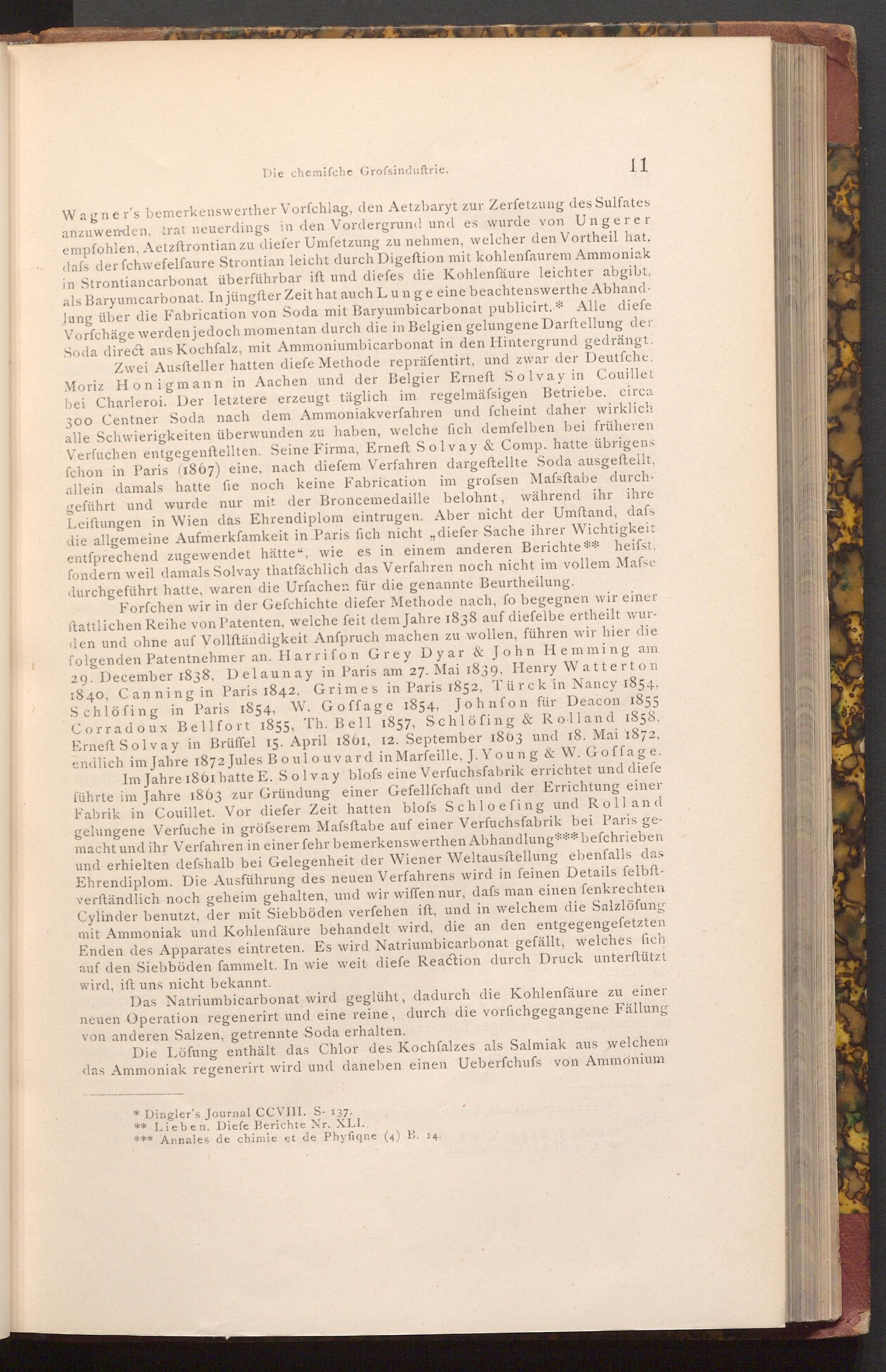 Wagner's bemerkenswerther Vorfchlag, den Aetzbaryt zur Zerfetzung des Sulfates anzuwenden, trat neuerdings in den Vordergrund und es wurde von Ungerer empfohlen, Aetzftrontian zu diefer Umfetzung zu nehmen, welcher den Vortheil hat, dafs der fchwefelfaure Strontian leicht durch Digeftion mit kohlenfaurem Ammoniak in Strontiancarbonat überführbar ift und diefes die Kohlenfäure leichter abgibt, als Baryumcarbonat. In jüngfter Zeit hat auch Lunge eine beachtenswerthe Abhandlung über die Fabrication von Soda mit Baryum bicarbonat publicirt. Alle diefe Vorfchäge werden jedoch momentan durch die in Belgien gelungene Darftellung der Soda direct aus Kochfalz, mit Ammoniumbicarbonat in den Hintergrund gedrängt. Zwei Aussteller hatten diefe Methode repräfentirt, und zwar der Deutfche. Moriz Honigmann in Aachen und der Belgier Erneft Solvay in Couillet bei Charleroi. Der letztere erzeugt täglich im regelmässigen Betriebe, circa 300 Centner Soda nach dem Ammoniakverfahren und fcheint daher wirklich alle Schwierigkeiten überwunden zu haben, welche fich demfelben bei früheren Verfuchen entgegenftellten. Seine Firma, Erneft Solvay& Comp. hatte übrigens fchon in Paris( 1867) eine, nach diefem Verfahren dargestellte Soda ausgeftellt, allein damals hatte fie noch keine Fabrication im grofsen Mafsftabe durchgeführt und wurde nur mit der Broncemedaille belohnt, während ihr ihre Leiftungen in Wien das Ehrendiplom eintrugen. Aber nicht der Umstand, dafs die allgemeine Aufmerkfamkeit in Paris fich nicht, diefer Sache ihrer Wichtigkeit entfprechend zugewendet hätte", wie es in einem anderen Berichte** heifst, fondern weil damals Solvay thatfächlich das Verfahren noch nicht im vollem Mafse durchgeführt hatte, waren die Urfachen für die genannte Beurtheilung.