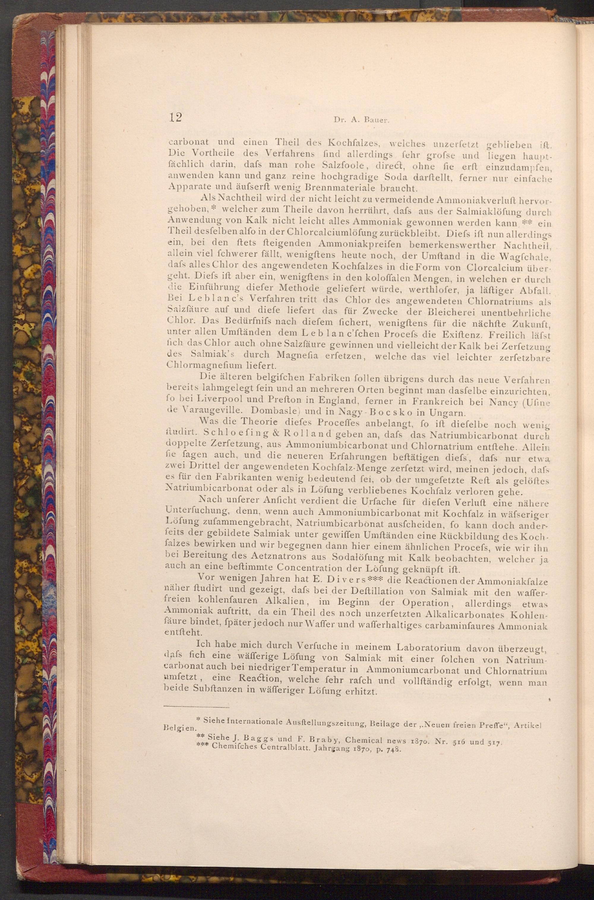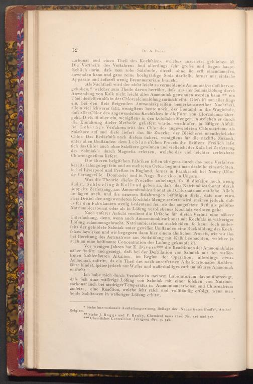 Was die Theorie diefes Proceffes anbelangt, fo ift diefelbe noch wenig fludirt. Schloefing& Rolland geben an, dafs das Natriumbicarbonat durch doppelte Zerfetzung, aus Ammoniumbicarbonat und Chlornatrium entſtehe. Allein fie fagen auch, und die neueren Erfahrungen beftätigen diefs, dafs nur etwa zwei Drittel der angewendeten Kochfalz- Menge zerfetzt wird, meinen jedoch, dafs es für den Fabrikanten wenig bedeutend fei, ob der umgefetzte Reft als gelöftes Natriumbicarbonat oder als in Löfung verbliebenes Kochfalz verloren gehe.