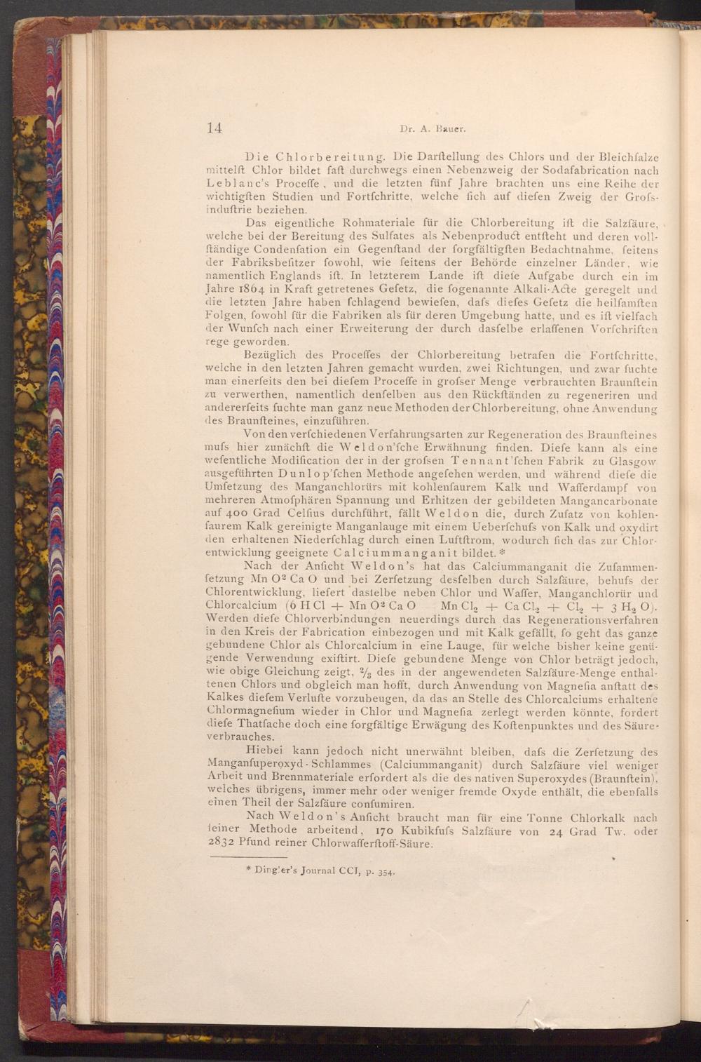 Von den verfchiedenen Verfahrungsarten zur Regeneration des Braunfteines mufs hier zunächft die Weldon'fche Erwähnung finden. Diefe kann als eine wefentliche Modification der in der grofsen Tennant'fchen Fabrik zu Glasgow ausgeführten Dunlop'fchen Methode angefehen werden, und während diefe die Umfetzung des Manganchlorürs mit kohlenfaurem Kalk und Wafferdampf von mehreren Atmoſphären Spannung und Erhitzen der gebildeten Mangancarbonate auf 400 Grad Celfius durchführt, fällt Weldon die, durch Zufatz von kohlenfaurem Kalk gereinigte Manganlauge mit einem Ueberfchufs von Kalk und oxydirt den erhaltenen Niederfchlag durch einen Luftftrom, wodurch fich das zur Chlorentwicklung geeignete Calciummanganit bildet.*