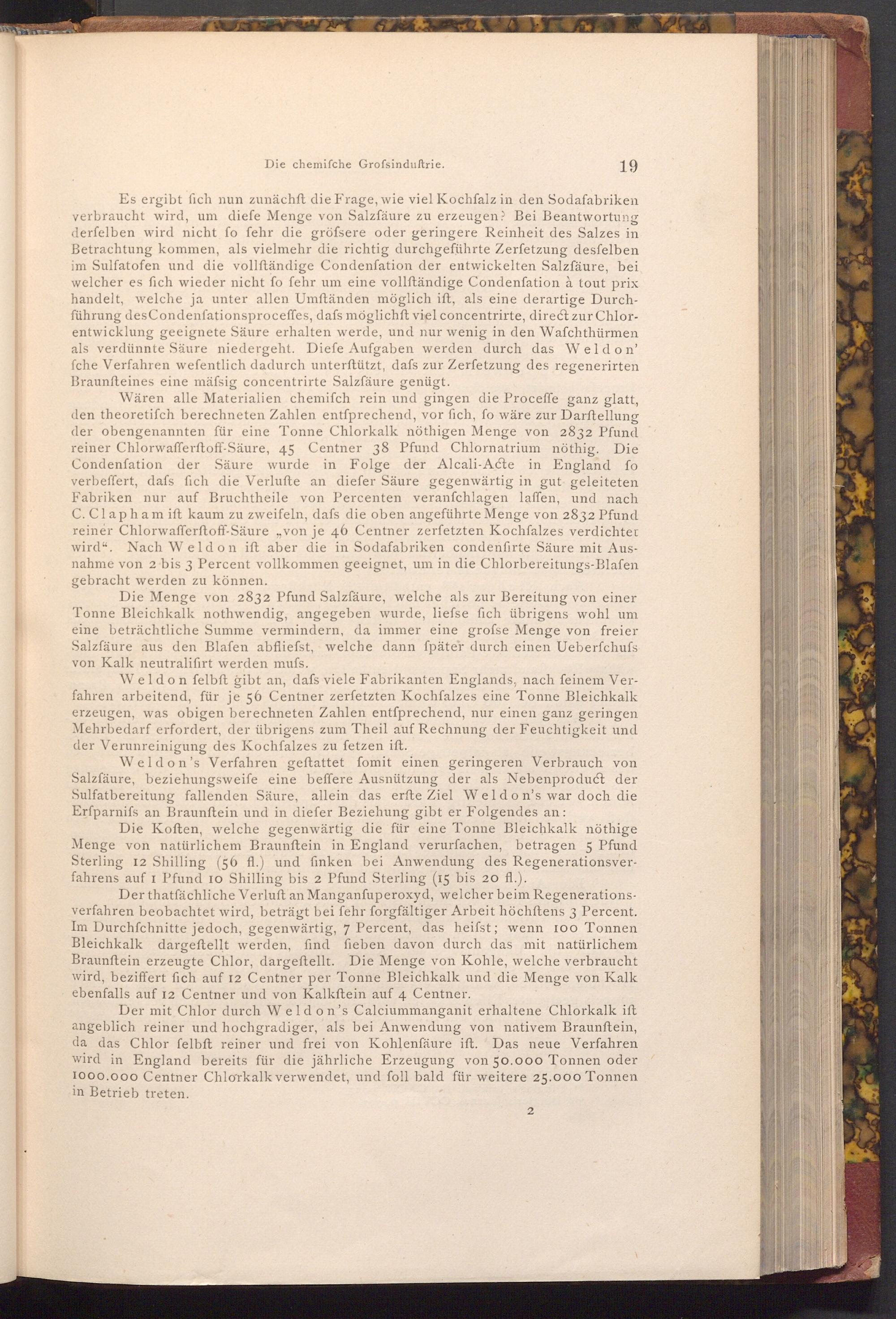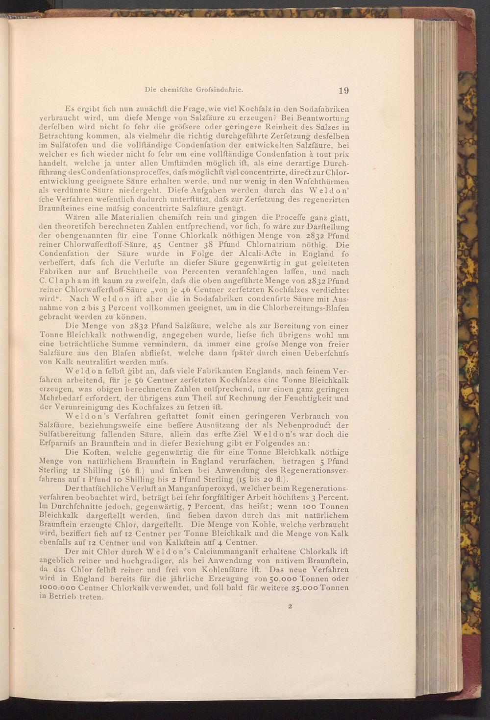 Weldon's Verfahren geftattet fomit einen geringeren Verbrauch von Salzfäure, beziehungsweife eine beffere Ausnützung der als Nebenproduct der Sulfatbereitung fallenden Säure, allein das erfte Ziel Weldon's war doch die Erfparnifs an Braunftein und in diefer Beziehung gibt er Folgendes an: