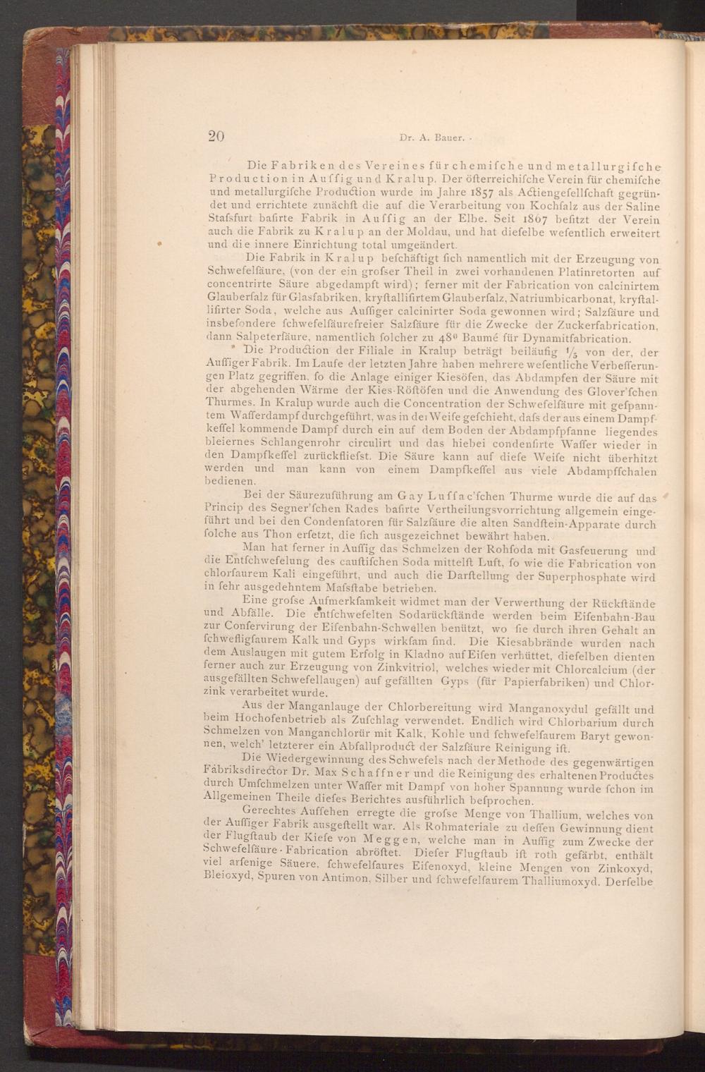 Die Fabrik in Kralup befchäftigt fich namentlich mit der Erzeugung von Schwefelfäure,( von der ein grofser Theil in zwei vorhandenen Platinretorten auf concentrirte Säure abgedampft wird); ferner mit der Fabrication von calcinirtem Glauberfalz für Glasfabriken, kryftallifirtem Glauberfalz, Natriumbicarbonat, kryftallifirter Soda, welche aus Auffiger calcinirter Soda gewonnen wird; Salzfäure und insbefondere fchwefelfäurefreier Salzfäure für die Zwecke der Zuckerfabrication, dann Salpeterfäure, namentlich folcher zu 480 Baumé für Dynamitfabrication.