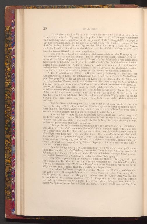 Eine grofse Aufmerkfamkeit widmet man der Verwerthung der Rückftände und Abfälle. Die entfchwefelten Sodarückftände werden beim Eifenbahn- Bau zur Confervirung der Eifenbahn- Schwellen benützt, wo fie durch ihren Gehalt an fchwefligfaurem Kalk und Gyps wirkfam find. Die Kiesabbrände wurden nach dem Auslaugen mit gutem Erfolg in Kladno auf Eifen verhüttet, diefelben dienten ferner auch zur Erzeugung von Zinkvitriol, welches wieder mit Chlorcalcium( der ausgefällten Schwefellaugen) auf gefällten Gyps( für Papierfabriken) und Chlorzink verarbeitet wurde.