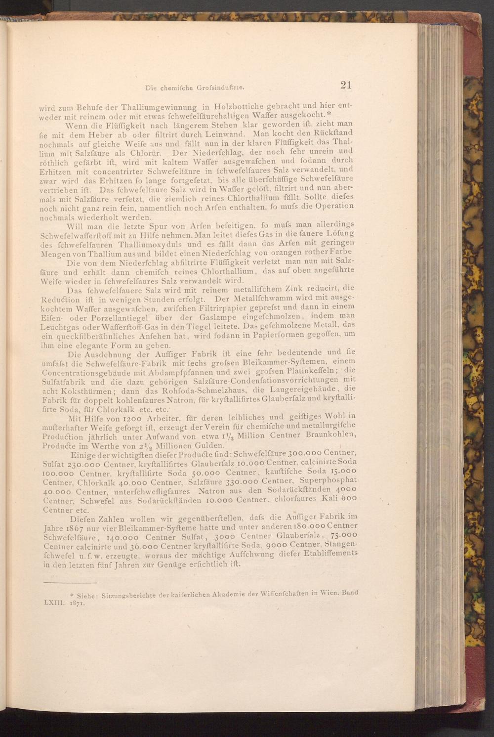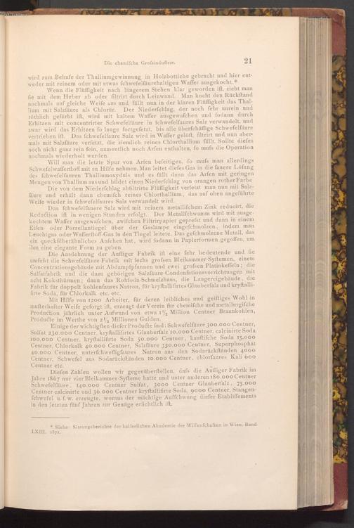 Die Ausdehnung der Auffiger Fabrik ift eine fehr bedeutende und fie umfafst die Schwefelfäure- Fabrik mit fechs grofsen Bleikammer- Syftemen, einem Concentrationsgebäude mit Abdampfpfannen und zwei grofsen Platinkeffeln; die Sulfatfabrik und die dazu gehörigen Salzfäure- Condenfationsvorrichtungen mit acht Koksthürmen; dann das Rohfoda- Schmelzhaus, die Laugereigebäude, die Fabrik für doppelt kohlenfaures Natron, für kryftallifirtes Glauberfalz und kryftallifirte Soda, für Chlorkalk etc. etc.