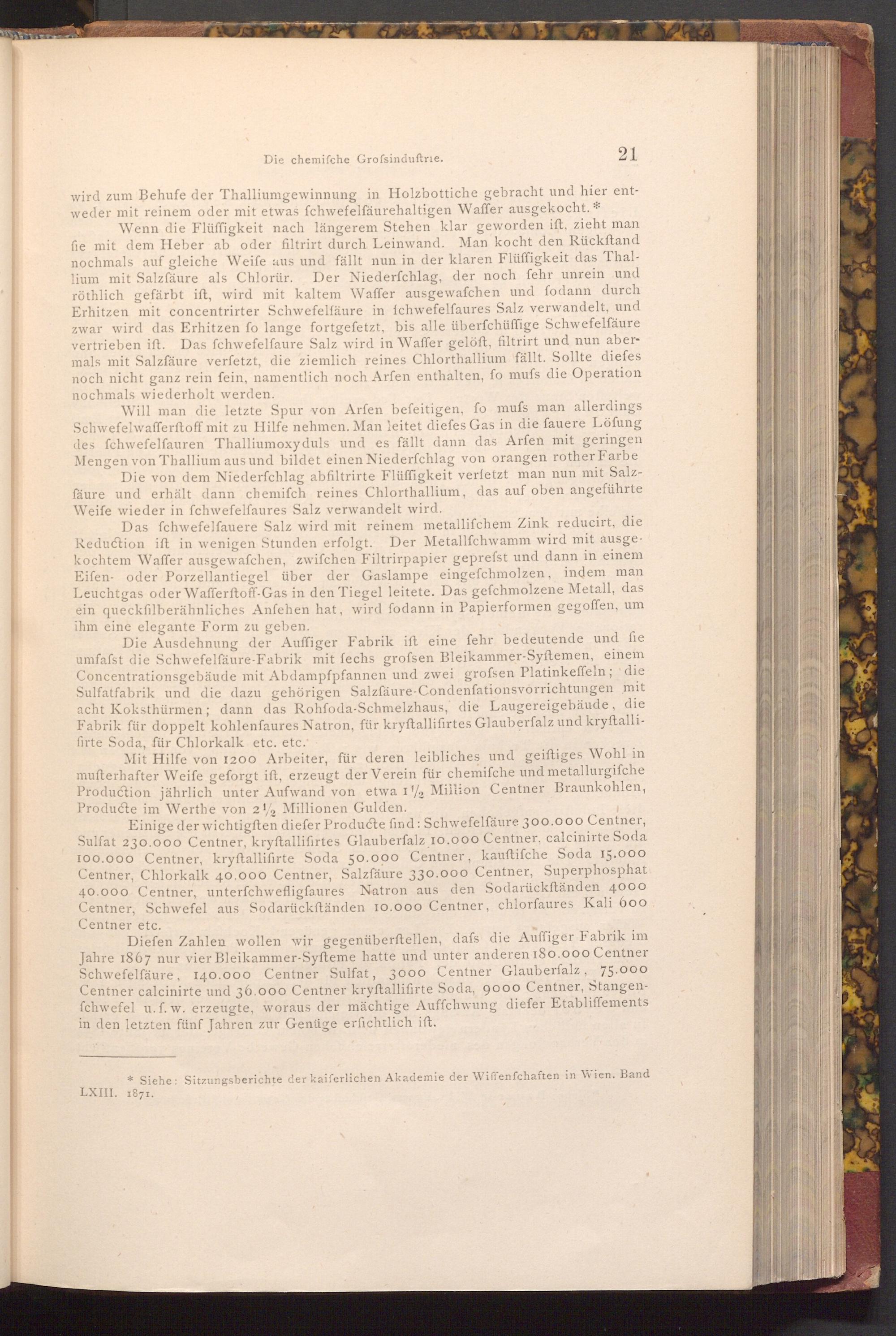 Diefen Zahlen wollen wir gegenüberftellen, dafs die Auffiger Fabrik im Jahre 1867 nur vier Bleikammer- Syfteme hatte und unter anderen 180.000 Centner Schwefelfäure, 140.000 Centner Sulfat, 3000 Centner Glauberfalz, 75.000 Centner calcinirte und 36.000 Centner kryftallifirte Soda, 9000 Centner, Stangenfchwefel u. f. w. erzeugte, woraus der mächtige Auffchwung diefer Etabliffements in den letzten fünf Jahren zur Genüge erfichtlich ift.