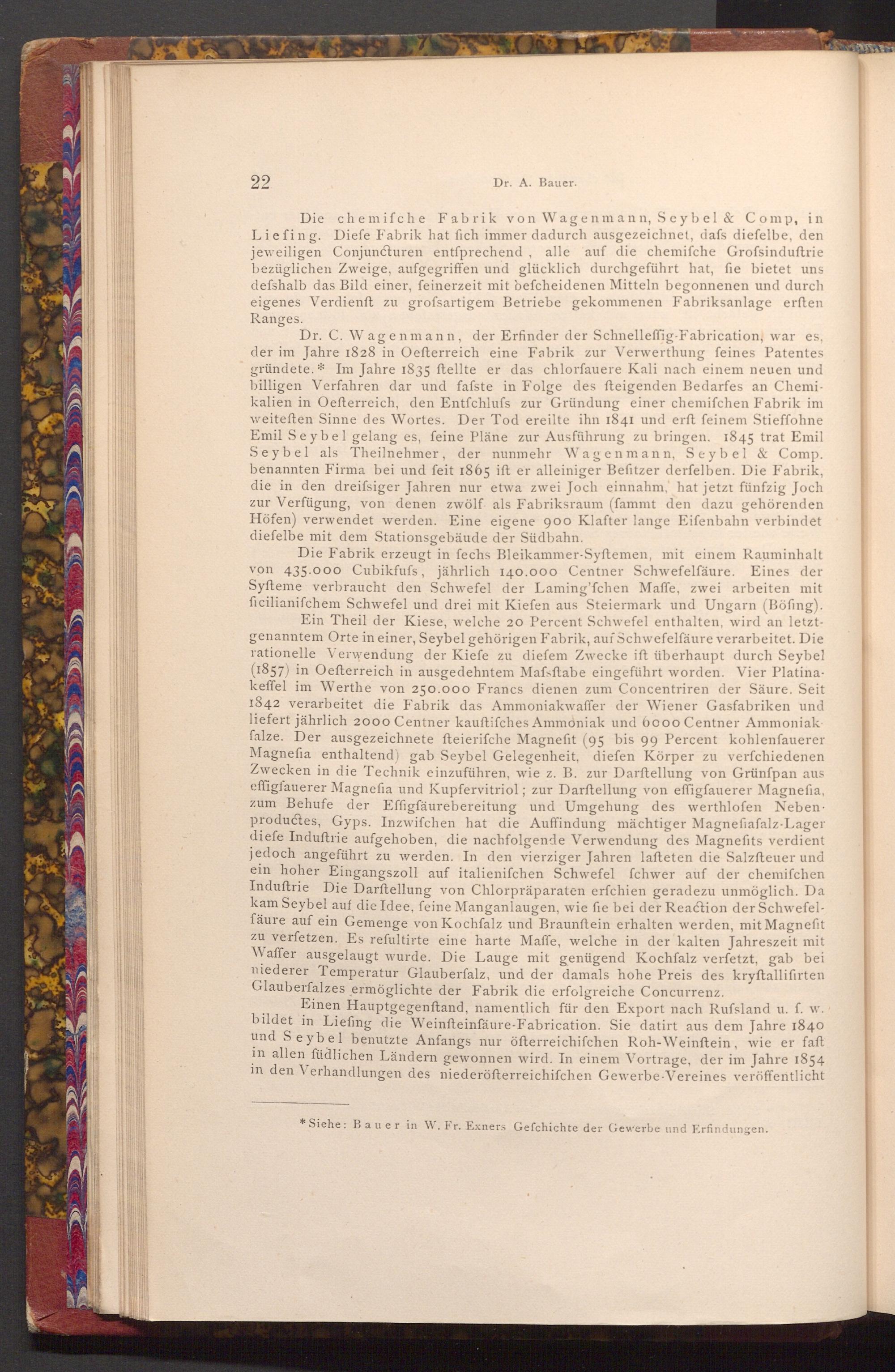 Dr. C. Wagenmann, der Erfinder der Schnelleffig- Fabrication, war es, der im Jahre 1828 in Oefterreich eine Fabrik zur Verwerthung feines Patentes gründete. Im Jahre 1835 ftellte er das chlorfauere Kali nach einem neuen und billigen Verfahren dar und fafste in Folge des fteigenden Bedarfes an Chemikalien in Oefterreich, den Entfchlufs zur Gründung einer chemifchen Fabrik im weiteften Sinne des Wortes. Der Tod ereilte ihn 1841 und erft feinem Stieffohne Emil Seybel gelang es, feine Pläne zur Ausführung zu bringen. 1845 trat Emil Seybel als Theilnehmer, der nunmehr Wagenmann, Seybel& Comp. benannten Firma bei und feit 1865 ift er alleiniger Befitzer derfelben. Die Fabrik, die in den dreifsiger Jahren nur etwa zwei Joch einnahm, hat jetzt fünfzig Joch zur Verfügung, von denen zwölf als Fabriksraum( fammt den dazu gehörenden Höfen) verwendet werden. Eine eigene 900 Klafter lange Eifenbahn verbindet diefelbe mit dem Stationsgebäude der Südbahn.
