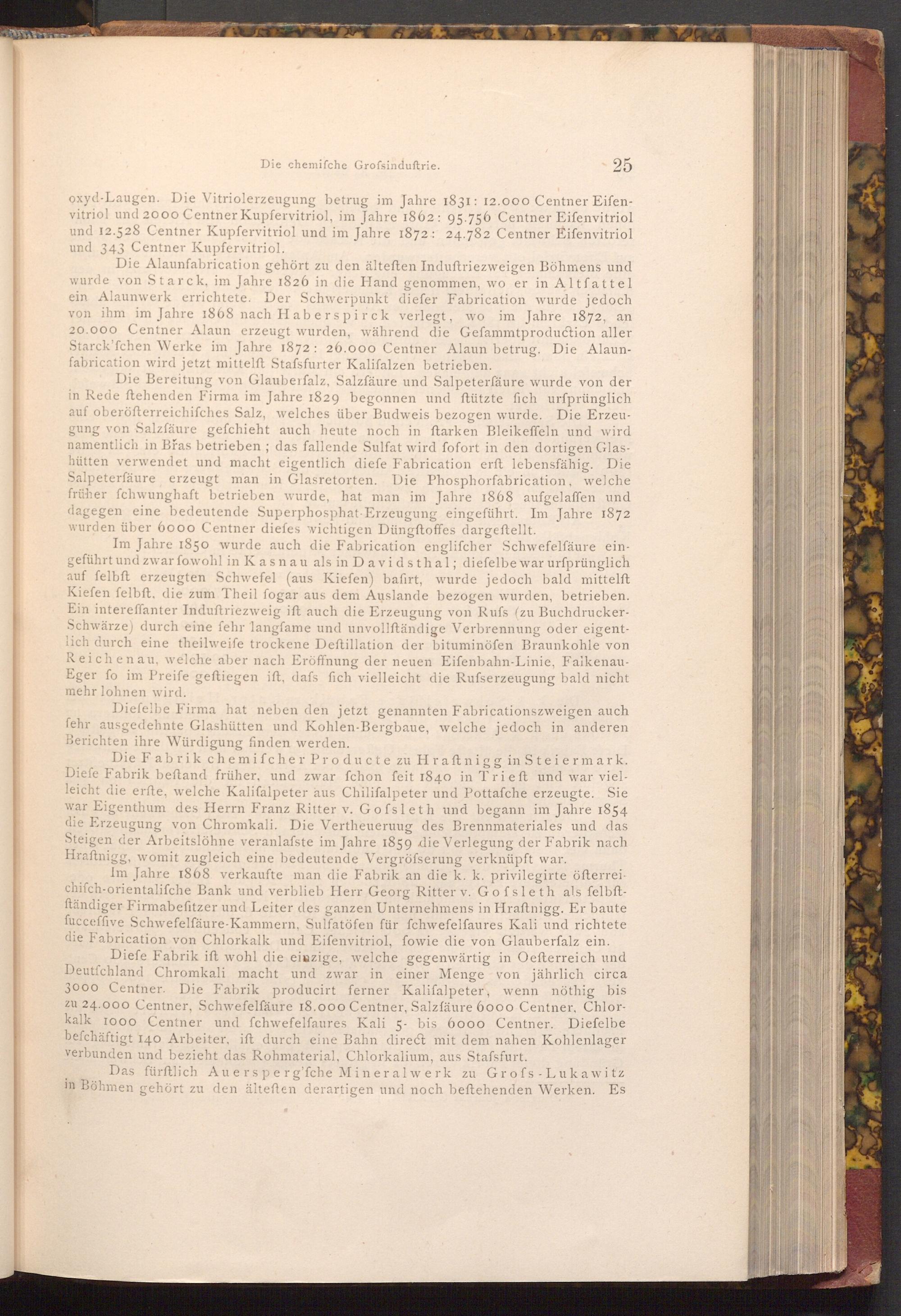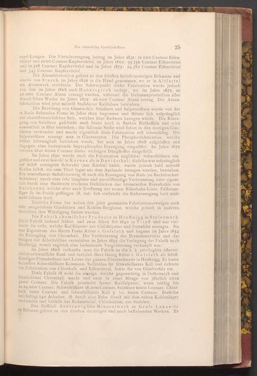 Die Bereitung von Glauberfalz, Salzfäure und Salpeterfäure wurde von der in Rede ftehenden Firma im Jahre 1829 begonnen und ftützte fich urfprünglich auf oberöfterreichifches Salz, welches über Budweis bezogen wurde. Die Erzeugung von Salzfäure gefchieht auch heute noch in ftarken Bleikeffeln und wird namentlich in Břas betrieben; das fallende Sulfat wird fofort in den dortigen Glashütten verwendet und macht eigentlich diefe Fabrication erft lebensfähig. Die Salpeterfäure erzeugt man in Glasretorten. Die Phosphorfabrication, welche früher fchwunghaft betrieben wurde, hat man im Jahre 1868 aufgelaffen und dagegen eine bedeutende Superphosphat Erzeugung eingeführt. Im Jahre 1872 wurden über 6000 Centner diefes wichtigen Düngftoffes dargestellt.