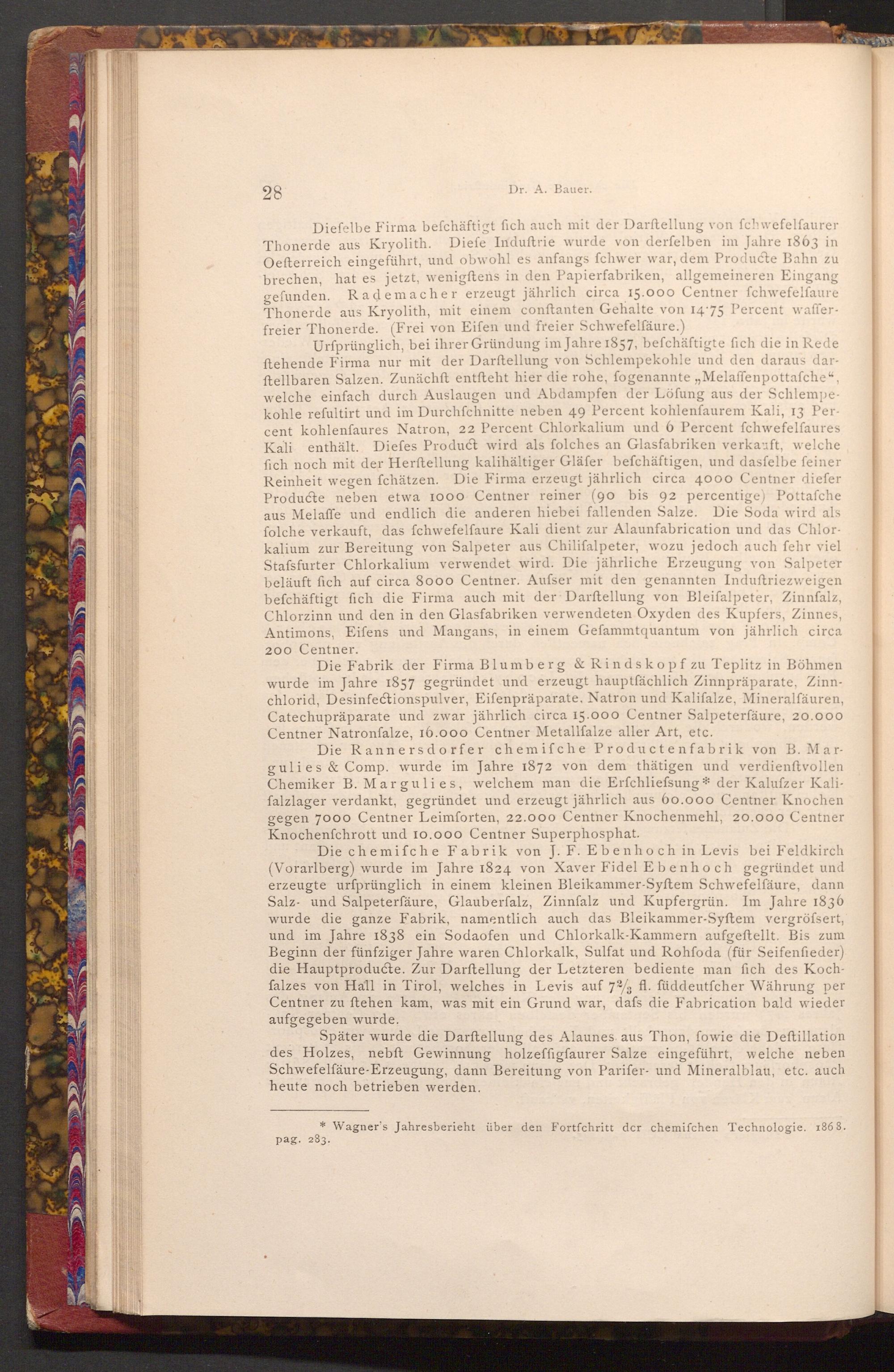 Die Rannersdorfer chemifche Productenfabrik von B. Margulies& Comp. wurde im Jahre 1872 von dem thätigen und verdienftvollen Chemiker B. Margulies, welchem man die Erfchliefsung der Kalufzer Kalifalzlager verdankt, gegründet und erzeugt jährlich aus 60.000 Centner Knochen gegen 7000 Centner Leimforten, 22.000 Centner Knochenmehl, 20.000 Centner Knochenfchrott und 10.000 Centner Superphosphat.
