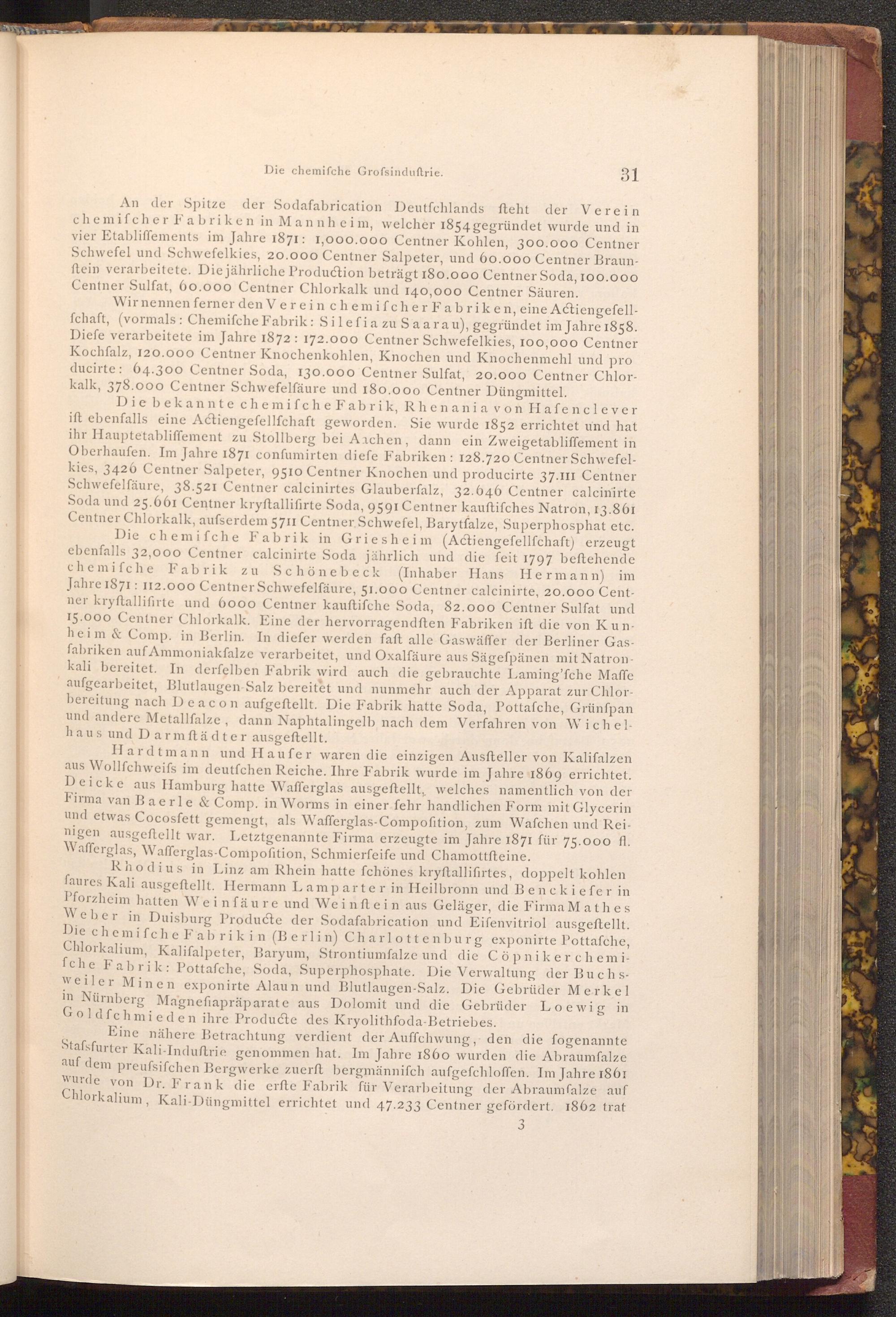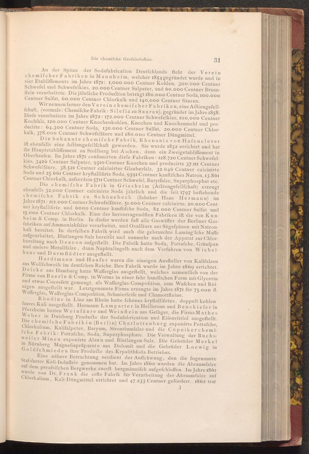 An der Spitze der Sodafabrication Deutfchlands fteht der Verein chemifcher Fabriken in Mannheim, welcher 1854 gegründet wurde und in vier Etabliffements im Jahre 1871: 1,000.000 Centner Kohlen, 300.000 Centner Schwefel und Schwefelkies, 20.000 Centner Salpeter, und 60.000 Centner Braunftein verarbeitete. Die jährliche Production beträgt 180.000 Centner Soda, 100.000 Centner Sulfat, 60.000 Centner Chlorkalk und 140,000 Centner Säuren.