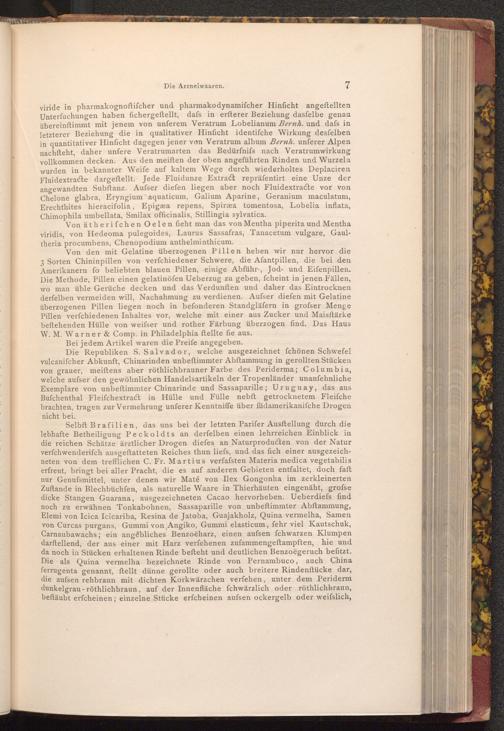 Die Republiken S. Salvador, welche ausgezeichnet fchönen Schwefel vulcanifcher Abkunft, Chinarinden unbeftimmter Abftammung in gerollten Stücken von grauer, meiftens aber röthlichbrauner Farbe des Periderma; Columbia, welche aufser den gewöhnlichen Handelsartikeln der Tropenländer unanfehnliche Exemplare von unbeftimmter Chinarinde und Sassaparille; Uruguay, das aus Bufchenthal Fleifchextract in Hülle und Fülle nebft getrocknetem Fleiſche brachten, tragen zur Vermehrung unferer Kenntniffe über füdamerikanifche Drogen nicht bei.