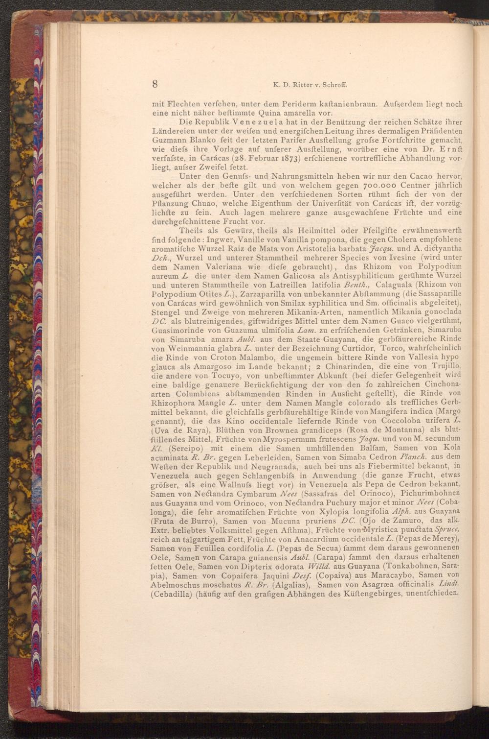 Theils als Gewürz, theils als Heilmittel oder Pfeilgifte erwähnenswerth find folgende: Ingwer, Vanille von Vanilla pompona, die gegen Cholera empfohlene aromatiſche Wurzel Raiz de Mata von Aristotelia barbata Jacqu. und A. dictyantha Dch., Wurzel und unterer Stammtheil mehrerer Species von Ivesine( wird unter dem Namen Valeriana wie diefe gebraucht), das Rhizom von Polypodium aureum Z die unter dem Namen Galicosa als Antisyphiliticum gerühmte Wurzel und unteren Stammtheile von Latreillea latifolia Benth., Calaguala( Rhizom von Polypodium Otites L.), Zarzaparilla von unbekannter Abftammung( die Sassaparille von Caracas wird gewöhnlich von Smilax syphilitica und Sm. officinalis abgeleitet), Stengel und Zweige von mehreren Mikania- Arten, namentlich Mikania gonoclada DC. als blutreinigendes, giftwidriges Mittel unter dem Namen Guaco vielgerühmt, Guasimorinde von Guazuma ulmifolia Lam. zu erfrifchenden Getränken, Simaruba von Simaruba amara Aubl. aus dem Staate Guayana, die gerbfäurereiche Rinde von Weinmannia glabra L. unter der Bezeichnung Curtidor, Torco, wahrfcheinlich die Rinde von Croton Malambo, die ungemein bittere Rinde von Vallesia hypo glauca als Amargoso im Lande bekannt; 2 Chinarinden, die eine von Trujillo, die andere von Tocuyo, von unbeftimmter Abkunft( bei diefer Gelegenheit wird eine baldige genauere Berücksichtigung der von den fo zahlreichen Cinchonaarten Columbiens abftammenden Rinden in Ausficht geftellt), die Rinde von Rhizophora Mangle L. unter dem Namen Mangle colorado als treffliches Gerbmittel bekannt, die gleichfalls gerbfäurehältige Rinde von Mangifera indica( Margo genannt), die das Kino occidentale liefernde Rinde von Coccoloba urifera L. ( Uva de Raya), Blüthen von Brownea grandiceps( Rosa de Montanna) als blutftillendes Mittel, Früchte von Myrospermum frutescens Jaqu. und von M. secundum Kl.( Sereipo) mit einem die Samen umhüllenden Balfam, Samen von Kola acuminata R. Br. gegen Leberleiden, Samen von Simaba Cedron Planch. aus dem Weften der Republik und Neugranada, auch bei uns als Fiebermittel bekannt, in Venezuela auch gegen Schlangenbifs in Anwendung( die ganze Frucht, etwas gröfser, als eine Wallnufs liegt vor) in Venezuela als Pepa de Cedron bekannt, Samen von Nectandra Cymbarum Nees( Sassafras del Orinoco), Pichurimbohnen aus Guayana und vom Orinoco, von Nectandra Puchury major et minor Nees( Cobalonga), die fehr aromatifchen Früchte von Xylopia longifolia Alph. aus Guayana ( Fruta de Burro), Samen von Mucuna pruriens DC.( Ojo de Zamuro, das alk. Extr. beliebtes Volksmittel gegen Afthma), Früchte von Myristica punctata Spruce, reich an talgartigem Fett, Früchte von Anacardium occidentale L.( Pepas de Merey), Samen von Feuillea cordifolia L.( Pepas de Secua) fammt dem daraus gewonnenen Oele, Samen von Carapa guianensis Aubl.( Carapa) fammt den daraus erhaltenen fetten Oele, Samen von Dipterix odorata Willd. aus Guayana( Tonkabohnen, Sarapia), Samen von Copaifera Jaquini Desf.( Copaiva) aus Maracaybo, Samen von Abelmoschus moschatus R. Br.( Algalias), Samen von Asagræa officinalis Lindt. ( Cebadilla)( häufig auf den grafigen Abhängen des Küftengebirges, unentfchieden,