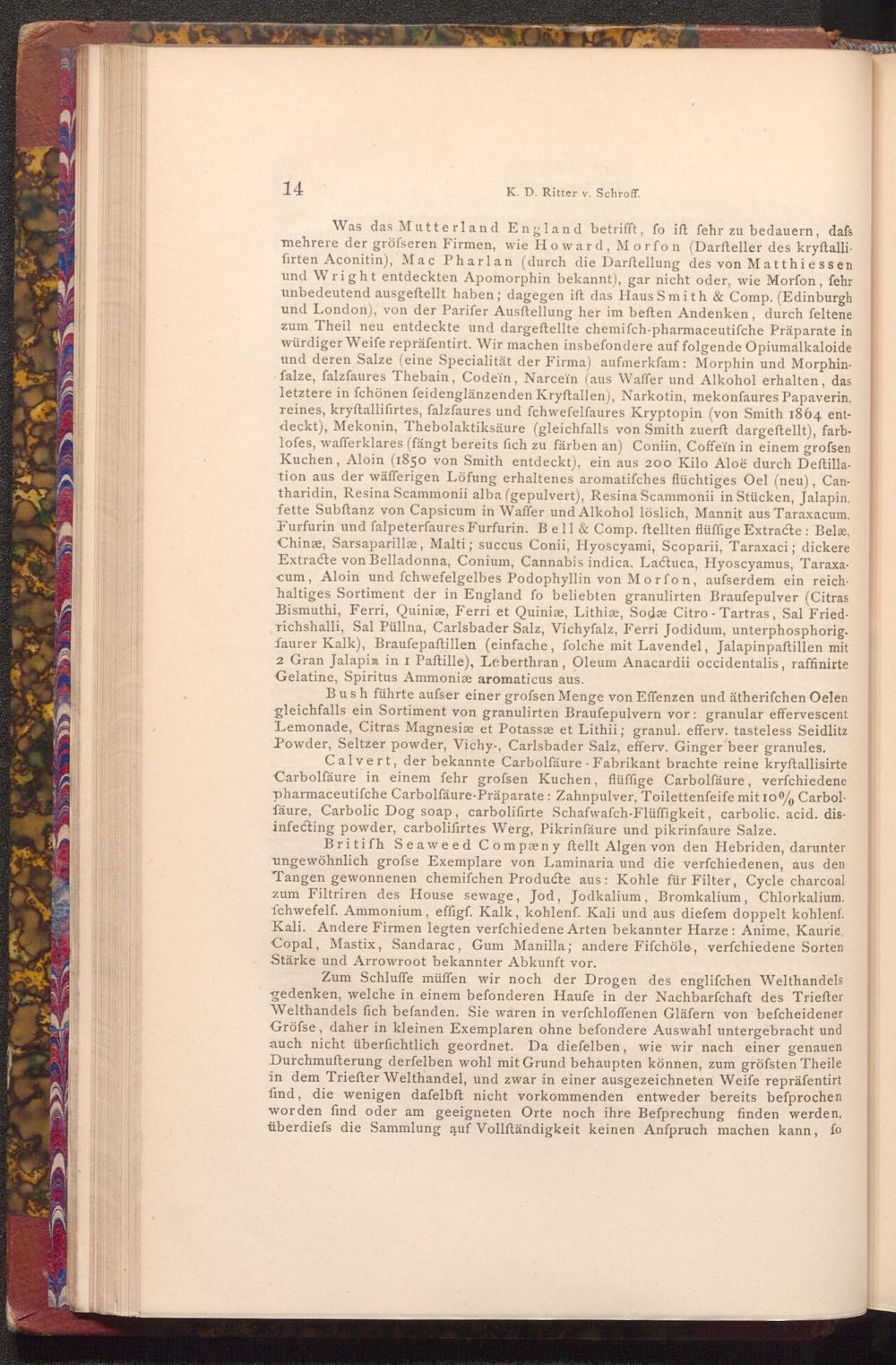 Was das Mutterland England betrifft, fo ift fehr zu bedauern, dafs mehrere der gröfseren Firmen, wie Howard, Morfon( Darfteller des kryftallifirten Aconitin), Mac Pharlan( durch die Darſtellung des von Matthiessen und Wright entdeckten Apomorphin bekannt), gar nicht oder, wie Morfon, fehr unbedeutend ausgeftellt haben; dagegen ift das Haus Smith& Comp.( Edinburgh und London), von der Parifer Ausftellung her im beften Andenken, durch feltene zum Theil neu entdeckte und dargestellte chemifch- pharmaceutifche Präparate in würdiger Weife repräfentirt. Wir machen insbefondere auf folgende Opiumalkaloide und deren Salze( eine Specialität der Firma) aufmerkfam: Morphin und Morphinfalze, falzfaures Thebain, Codeïn, Narceïn( aus Waffer und Alkohol erhalten, das letztere in fchönen feidenglänzenden Kryftallen), Narkotin, mekonfaures Papaverin, reines, kryftallifirtes, falzfaures und fchwefelfaures Kryptopin( von Smith 1864 entdeckt), Mekonin, Thebolaktiksäure( gleichfalls von Smith zuerft dargeftellt), farblofes, wafferklares( fängt bereits fich zu färben an) Coniin, Coffeïn in einem grofsen Kuchen, Aloin( 1850 von Smith entdeckt), ein aus 200 Kilo Aloë durch Deftillation aus der wäfferigen Löfung erhaltenes aromatifches flüchtiges Oel( neu), Cantharidin, Resina Scammonii alba( gepulvert), Resina Scammonii in Stücken, Jalapin, fette Subftanz von Capsicum in Waffer und Alkohol löslich, Mannit aus Taraxacum, Furfurin und falpeterfaures Furfurin. Bell& Comp. ftellten flüffige Extracte: Belæ, China, Sarsaparillæ, Malti; succus Conii, Hyoscyami, Scoparii, Taraxaci; dickere Extracte von Belladonna, Conium, Cannabis indica, Lactuca, Hyoscyamus, Taraxacum, Aloin und fchwefelgelbes Podophyllin von Morfon, aufserdem ein reichhaltiges Sortiment der in England fo beliebten granulirten Braufepulver( Citras Bismuthi, Ferri, Quiniæ, Ferri et Quiniæ, Lithiæ, Soda Citro Tartras, Sal Friedrichshalli, Sal Püllna, Carlsbader Salz, Vichyfalz, Ferri Jodidum, unterphosphorig. faurer Kalk), Braufepaftillen( einfache, folche mit Lavendel, Jalapinpaftillen mit 2 Gran Jalapin in 1 Paftille), Leberthran, Oleum Anacardii occidentalis, raffinirte Gelatine, Spiritus Ammoniæ aromaticus aus.