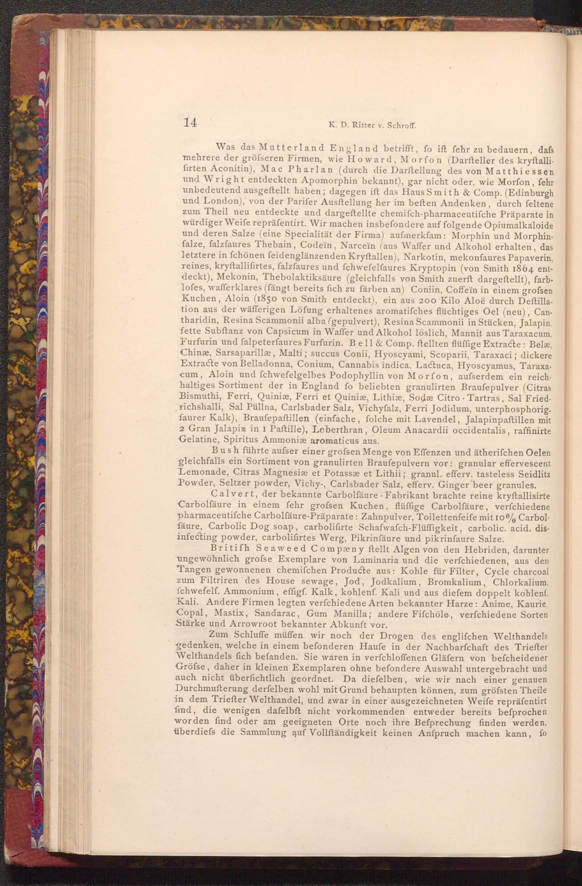 Zum Schluffe müffen wir noch der Drogen des englifchen Welthandels gedenken, welche in einem befonderen Haufe in der Nachbarfchaft des Triefter Welthandels fich befanden. Sie waren in verfchloffenen Gläfern von befcheidener Gröfse, daher in kleinen Exemplaren ohne befondere Auswahl untergebracht und auch nicht überfichtlich geordnet. Da diefelben, wie wir nach einer genauen Durchmufterung derfelben wohl mit Grund behaupten können, zum gröfsten Theile in dem Triefter Welthandel, und zwar in einer ausgezeichneten Weife repräfentirt find, die wenigen dafelbft nicht vorkommenden entweder bereits befprochen worden find oder am geeigneten Orte noch ihre Befprechung finden werden, überdiefs die Sammlung auf Vollständigkeit keinen Anfpruch machen kann, fo