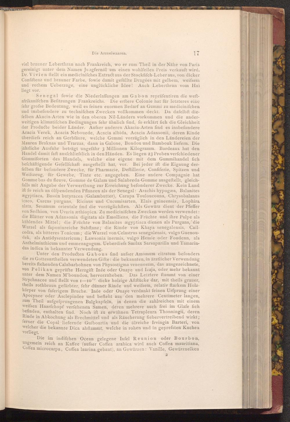 Senegal fowie die Niederlaffungen am Gabon repräfentiren die weftafrikanifchen Befitzungen Frankreichs. Die erftere Colonie hat für letzteres eine fehr grofse Bedeutung, weil es feinen enormen Bedarf an Gummi zu medicinifchen und insbefondere zu technifchen Zwecken vollkommen deckt. Da dafelbft diefelben Akacia- Arten wie in den oberen Nil- Ländern vorkommen und die anderweitigen klimatifchen Bedingungen fehr ähnlich find, fo erklärt fich die Gleichheit der Producte beider Länder. Aufser anderen Akacia- Arten find es insbefondere Acacia Verek, Acacia Nebouede, Acacia albida, Acacia Adansonii, deren Rinde überdiefs reich an Gerbfäure, welche Gummi vorzüglich in den Ländereien der Mauren Braknas und Trarzas, dann in Galone, Bondou und Bambouk liefern. Die jährliche Ausfuhr beträgt ungefähr 3 Millionen Kilogramm. Bordeaux hat den Handel damit faft ausfchliefslich in den Händen. Es liegen 23 Proben verfchiedener Gummiforten des Handels, welche eine eigene mit dem Gummihandel fich befchäftigende Gefellſchaft ausgeftellt hat, vor. Bei jeder ift die Eignung derfelben für befondere Zwecke, für Pharmacie, Deftillerie, Confiferie, Spitzen und Weifszeug, für Gewebe, Tinte etc. angegeben. Eine andere Compagnie hat Gomme bas du fleuve, Gomme de Galam und Salabreda- Gomme ausgeftellt, gleichfalls mit Angabe der Verwerthung zur Erreichung befonderer Zwecke. Kein Land ift fo reich an ölfpendenden Pflanzen als der Senegal: Arachis hypogæa, Balanites ægyptiaca, Bassia butyracea( Galambutter), Carapa Touloucouna, Chrysobalanus icaco, Curcas purgans, Ricinus und Cucumisarten, Elais guineensis, Lophira alata, Sesamum orientale find die vorzüglichften. Als Gewürz dient der Pfeffer von Sedhion, von Uvaria æthiopica. Zu medicinifchen Zwecken werden verwendet: die Blätter von Adansonia digitata als Emolliens, die Früchte und ihre Pulpe als kühlendes Mittel; die Früchte von Balanites ægyptiaca dienen als Purgans, die Wurzel als faponinreiche Subftanz; die Rinde von Khaya senegalensis, Cail cedra, als bitteres Tonicum; die Wurzel von Celastrus senegalensis, vulgo Guenoudek, als Antidysentericum; Lawsonia inermis, vulgo Hemie oder Foudenn, als Anthelminthicum und emmenagogum. Ueberdiefs Smilax Sarsaparilla und Tamarindus indica in bekannter Verwendung.