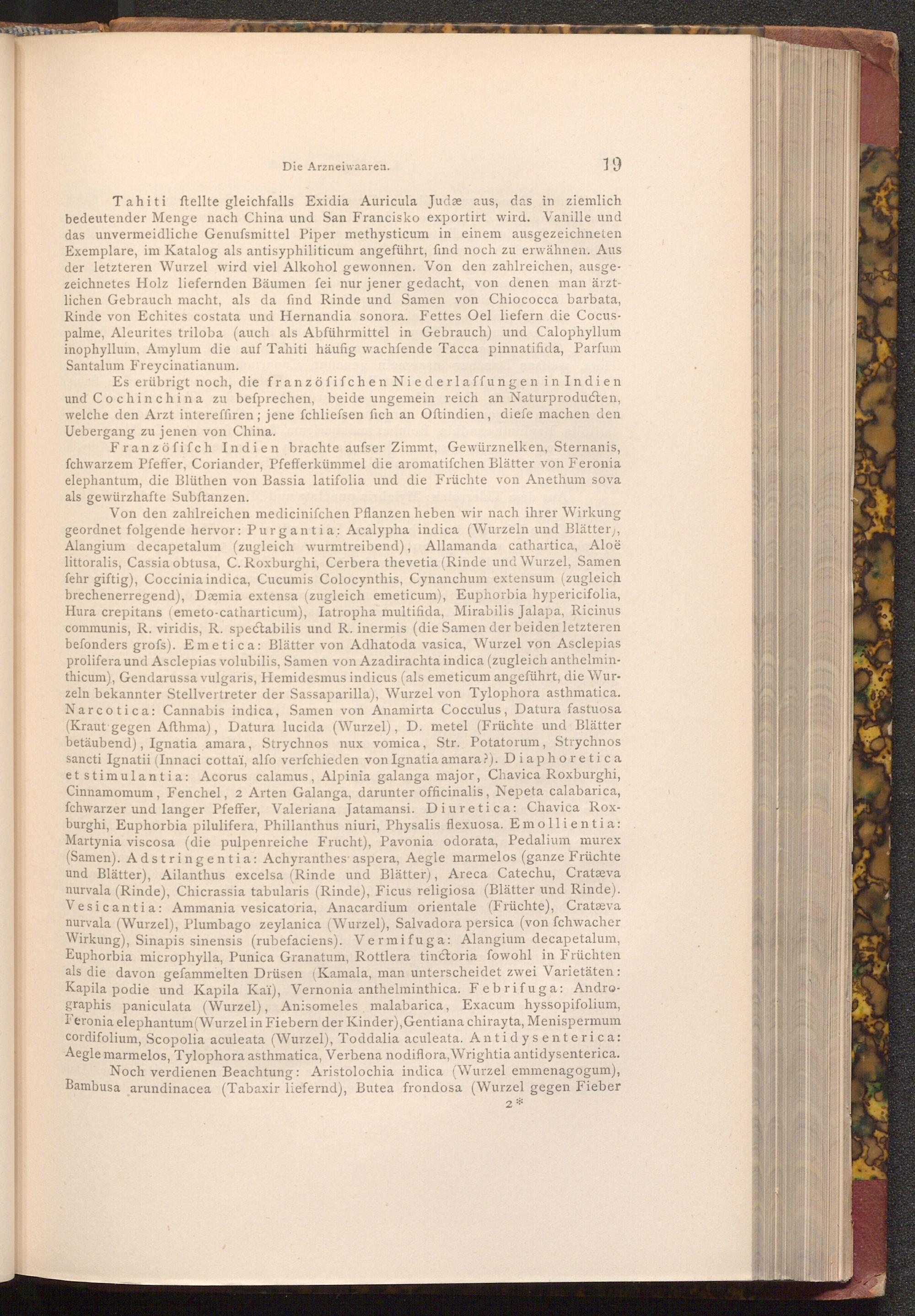 Von den zahlreichen medicinifchen Pflanzen heben wir nach ihrer Wirkung geordnet folgende hervor: Purgantia: Acalypha indica( Wurzeln und Blätter), Alangium decapetalum( zugleich wurmtreibend), Allamanda cathartica, Aloë littoralis, Cassia obtusa, C. Roxburghi, Cerbera thevetia( Rinde und Wurzel, Samen fehr giftig), Coccinia indica, Cucumis Colocynthis, Cynanchum extensum( zugleich brechenerregend), Dæmia extensa( zugleich emeticum), Euphorbia hypericifolia, Hura crepitans( emeto- catharticum), Iatropha multifida, Mirabilis Jalapa, Ricinus communis, R. viridis, R. spectabilis und R. inermis( die Samen der beiden letzteren befonders grofs). Emetica: Blätter von Adhatoda vasica, Wurzel von Asclepias prolifera und Asclepias volubilis, Samen von Azadirachta indica( zugleich anthelminthicum), Gendarussa vulgaris, Hemidesmus indicus( als emeticum angeführt, die Wurzeln bekannter Stellvertreter der Sassaparilla), Wurzel von Tylophora asthmatica. Narcotica: Cannabis indica, Samen von Anamirta Cocculus, Datura fastuosa ( Kraut gegen Afthma), Datura lucida( Wurzel), D. metel( Früchte und Blätter betäubend), Ignatia amara, Strychnos nux vomica, Str. Potatorum, Strychnos sancti Ignatii( Innaci cottaï, alfo verfchieden von Ignatia amara?). Diaphoretica et stimulantia: Acorus calamus, Alpinia galanga major, Chavica Roxburghi, Cinnamomum, Fenchel, 2 Arten Galanga, darunter officinalis, Nepeta calabarica, fchwarzer und langer Pfeffer, Valeriana Jatamansi. Diuretica: Chavica Roxburghi, Euphorbia pilulifera, Phillanthus niuri, Physalis flexuosa. Emollientia: Martynia viscosa( die pulpenreiche Frucht), Pavonia odorata, Pedalium murex ( Samen). Adstringentia: Achyranthes aspera, Aegle marmelos( ganze Früchte und Blätter), Ailanthus excelsa( Rinde und Blätter), Areca Catechu, Cratæva nurvala( Rinde), Chicrassia tabularis( Rinde), Ficus religiosa( Blätter und Rinde). Vesicantia: Ammania vesicatoria, Anacardium orientale( Früchte), Cratæva nurvala( Wurzel), Plumbago zeylanica( Wurzel), Salvadora persica( von fchwacher Wirkung), Sinapis sinensis( rubefaciens). Vermifuga: Alangium decapetalum, Euphorbia microphylla, Punica Granatum, Rottlera tinctoria fowohl in Früchten als die davon gefammelten Drüsen( Kamala, man unterscheidet zwei Varietäten: Kapila podie und Kapila Kaï), Vernonia anthelminthica. Febrifuga: Andrographis paniculata( Wurzel), Anisomeles malabarica, Exacum hyssopifolium, Feronia elephantum( Wurzel in Fiebern der Kinder), Gentiana chirayta, Menispermum cordifolium, Scopolia aculeata( Wurzel), Toddalia aculeata. Antidysenterica: Aegle marmelos, Tylophora asthmatica, Verbena nodiflora, Wrightia antidysenterica. Noch verdienen Beachtung: Aristolochia indica( Wurzel emmenagogum), Bambusa arundinacea( Tabaxir liefernd), Butea frondosa( Wurzel gegen Fieber