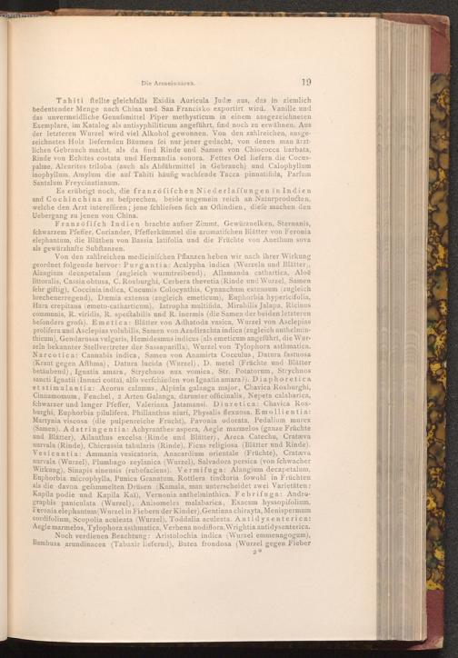Tahiti ftellte gleichfalls Exidia Auricula Judæ aus, das in ziemlich bedeutender Menge nach China und San Francisko exportirt wird. Vanille und das unvermeidliche Genufsmittel Piper methysticum in einem ausgezeichneten Exemplare, im Katalog als antisyphiliticum angeführt, find noch zu erwähnen. Aus der letzteren Wurzel wird viel Alkohol gewonnen. Von den zahlreichen, ausgezeichnetes Holz liefernden Bäumen fei nur jener gedacht, von denen man ärztlichen Gebrauch macht, als da find Rinde und Samen von Chiococca barbata, Rinde von Echites costata und Hernandia sonora. Fettes Oel liefern die Cocuspalme, Aleurites triloba( auch als Abführmittel in Gebrauch) und Calophyllum inophyllum, Amylum die auf Tahiti häufig wachfende Tacca pinnatifida, Parfum Santalum Freycinatianum.