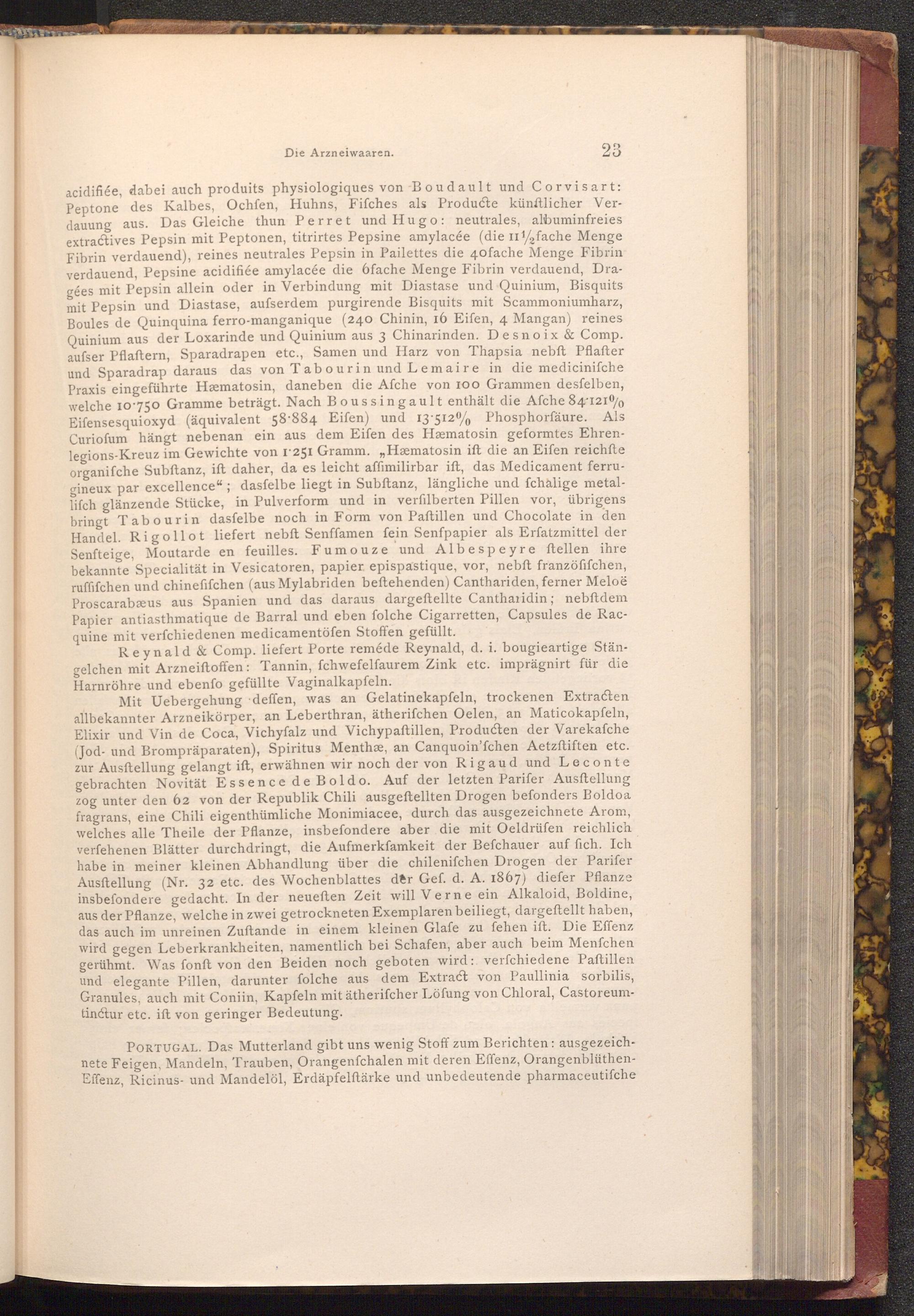 Mit Uebergehung deffen, was an Gelatinekapfeln, trockenen Extracten allbekannter Arzneikörper, an Leberthran, ätherifchen Oelen, an Maticokapfeln, Elixir und Vin de Coca, Vichyfalz und Vichypaftillen, Producten der Varekafche ( Jod- und Brompräparaten), Spiritus Menthæ, an Canquoin'fchen Aetzftiften etc. zur Ausftellung gelangt ift, erwähnen wir noch der von Rigaud und Leconte gebrachten Novität Essence de Boldo. Auf der letzten Parifer Ausftellung zog unter den 62 von der Republik Chili ausgeftellten Drogen befonders Boldoa fragrans, eine Chili eigenthümliche Monimiacee, durch das ausgezeichnete Arom, welches alle Theile der Pflanze, insbefondere aber die mit Oeldrüfen reichlich verfehenen Blätter durchdringt, die Aufmerkfamkeit der Befchauer auf fich. Ich habe in meiner kleinen Abhandlung über die chilenifchen Drogen der Parifer Ausftellung( Nr. 32 etc. des Wochenblattes der Gef. d. A. 1867) diefer Pflanze insbefondere gedacht. In der neueſten Zeit will Verne ein Alkaloid, Boldine, aus der Pflanze, welche in zwei getrockneten Exemplaren beiliegt, dargeftellt haben, das auch im unreinen Zuftande in einem kleinen Glafe zu fehen ift. Die Effenz wird gegen Leberkrankheiten, namentlich bei Schafen, aber auch beim Menfchen gerühmt. Was fonft von den Beiden noch geboten wird: verfchiedene Paftillen und elegante Pillen, darunter folche aus dem Extract von Paullinia sorbilis, Granules, auch mit Coniin, Kapfeln mit ätherifcher Löfung von Chloral, Castoreumtinctur etc. ift von geringer Bedeutung.