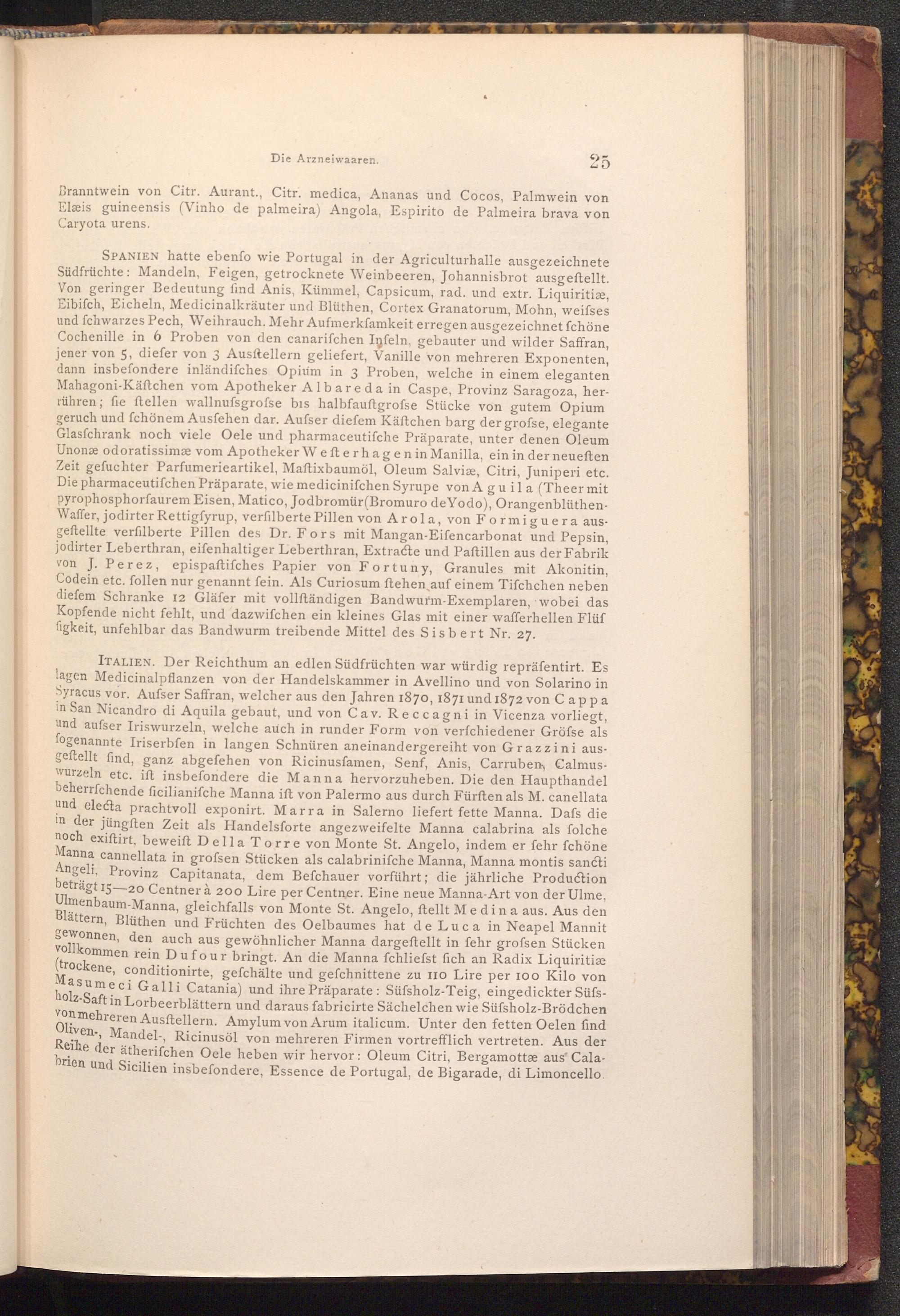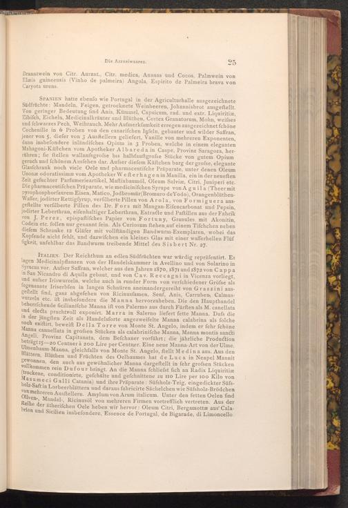 ITALIEN. Der Reichthum an edlen Südfrüchten war würdig repräfentirt. Es lagen Medicinalpflanzen von der Handelskammer in Avellino und von Solarino in Syracus vor. Aufser Saffran, welcher aus den Jahren 1870, 1871 und 1872 von Cappa in San Nicandro di Aquila gebaut, und von Cav. Reccagni in Vicenza vorliegt, und aufser Iriswurzeln, welche auch in runder Form von verfchiedener Gröfse als fogenannte Iriserbfen in langen Schnüren aneinandergereiht von Grazzini ausgeftellt find, ganz abgefehen von Ricinusfamen, Senf, Anis, Carruben, Calmuswurzeln etc. ift insbefondere die Manna hervorzuheben. Die den Haupthandel beherrschende ficilianifche Manna ift von Palermo aus durch Fürften als M. canellata und electa prachtvoll exponirt. Marra in Salerno liefert fette Manna. Dafs die in der jüngften Zeit als Handelsforte angezweifelte Manna calabrina als folche noch exiftirt, beweift Della Torre von Monte St. Angelo, indem er fehr fchöne Manna cannellata in grofsen Stücken als calabrinifche Manna, Manna montis sancti Angeli, Provinz Capitanata, dem Befchauer vorführt; die jährliche Production beträgt 15-20 Centner à 200 Lire per Centner. Eine neue Manna- Art von der Ulme, Ulmenbaum- Manna, gleichfalls von Monte St. Angelo, ftellt Medina aus. Aus den Blättern, Blüthen und Früchten des Oelbaumes hat de Luca in Neapel Mannit gewonnen, den auch aus gewöhnlicher Manna dargestellt in fehr grofsen Stücken vollkommen rein Dufour bringt. An die Manna fchliefst fich an Radix Liquiritiæ ( trockene, conditionirte, gefchälte und gefchnittene zu IIO Lire per 100 Kilo von Masumeci Galli Catania) und ihre Präparate: Süfsholz- Teig, eingedickter Süfsholz- Saft in Lorbeerblättern und daraus fabricirte Sächelchen wie Süfsholz- Brödchen von mehreren Ausstellern. Amylum von Arum italicum. Unter den fetten Oelen find Oliven-, Mandel-, Ricinusöl von mehreren Firmen vortrefflich vertreten. Aus der Reihe der ätherifchen Oele heben wir hervor: Oleum Citri, Bergamottæ aus Calabrien und Sicilien insbesondere, Essence de Portugal, de Bigarade, di Limoncello.