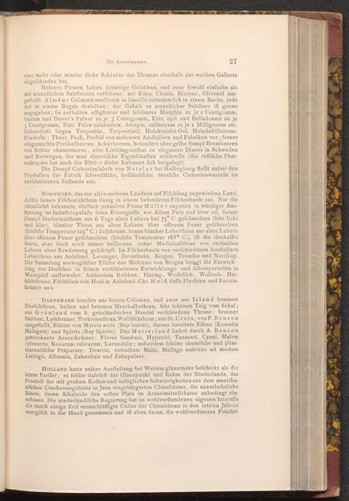 DAENEMARK brachte aus feinen Colonien, und zwar aus Island braunen Dorfchthran, hellen und braunen Meerkalbsthran, fehr fchönen Talg vom Schaf; aus Grönland vom k. grönländischen Handel verfchiedene Thrane: brauner Sæltran, Lyfebruner, Trekronethran, Wallfifchthran; aus St. Croix, von F. Benzon ausgeftellt, Blätter von Myrcia acris( Bay- leaves), daraus bereitete Effenz( Essentia Malageta) und Spirits( Bay Spirits). Das Mutterland liefert durch A. Benzon getrocknete Arzneikräuter: Flores Sambuci, Hyperici, Tanaceti, Cyani, Malvæ sylvestris, Rosarum rubrarum, Lavandulæ; aufserdem fchöne chemifche und pharmaceutifche Präparate: Dextrin, extractum Malti, Mellago nutriens ad modum Liebigii, Albumin, Zahnelixir und Zahnpulver.