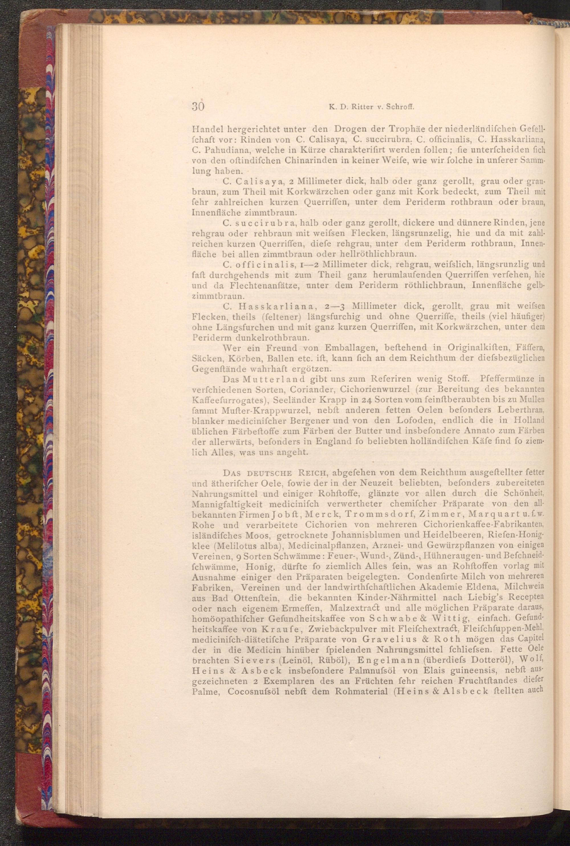 Handel hergerichtet unter den Drogen der Trophäe der niederländifchen Gefellfchaft vor: Rinden von C. Calisaya, C. succirubra, C. officinalis, C. Hasskarliana, C. Pahudiana, welche in Kürze charakterifirt werden follen; fie unterfcheiden fich von den oftindifchen Chinarinden in keiner Weife, wie wir folche in unferer Sammlung haben.