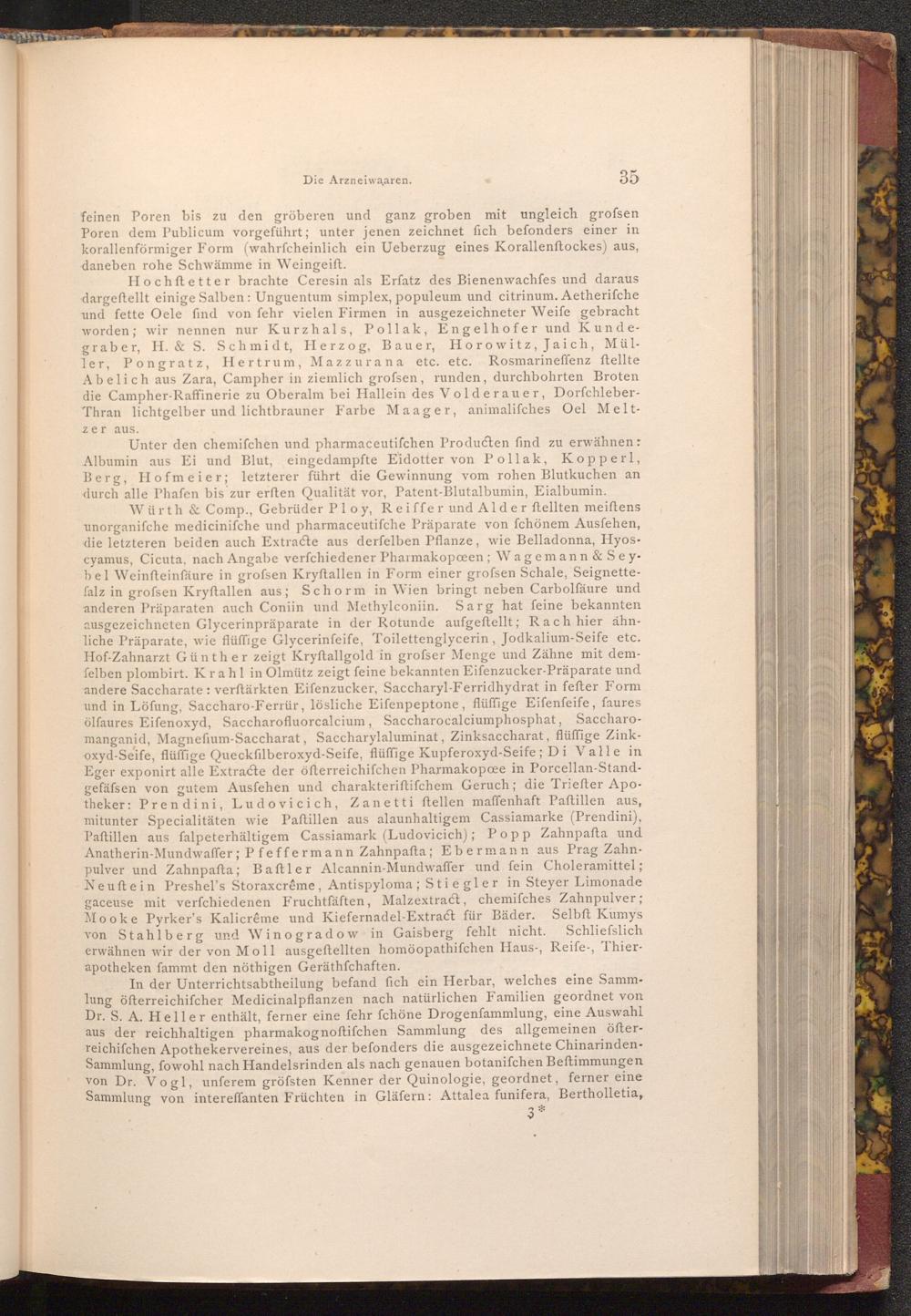 Hochftetter brachte Ceresin als Erfatz des Bienenwachfes und daraus dargestellt einige Salben: Unguentum simplex, populeum und citrinum. Aetherifche und fette Oele find von fehr vielen Firmen in ausgezeichneter Weife gebracht worden; wir nennen nur Kurzhals, Pollak, Engelhofer und Kundegraber, H.& S. Schmidt, Herzog, Bauer, Horowitz, Jaich, Müller, Pongratz, Hertrum, Mazzurana etc. etc. Rosmarineffenz ftellte Abelich aus Zara, Campher in ziemlich grofsen, runden, durchbohrten Broten die Campher- Raffinerie zu Oberalm bei Hallein des Volderauer, DorfchleberThran lichtgelber und lichtbrauner Farbe Maager, animalifches Oel Melt