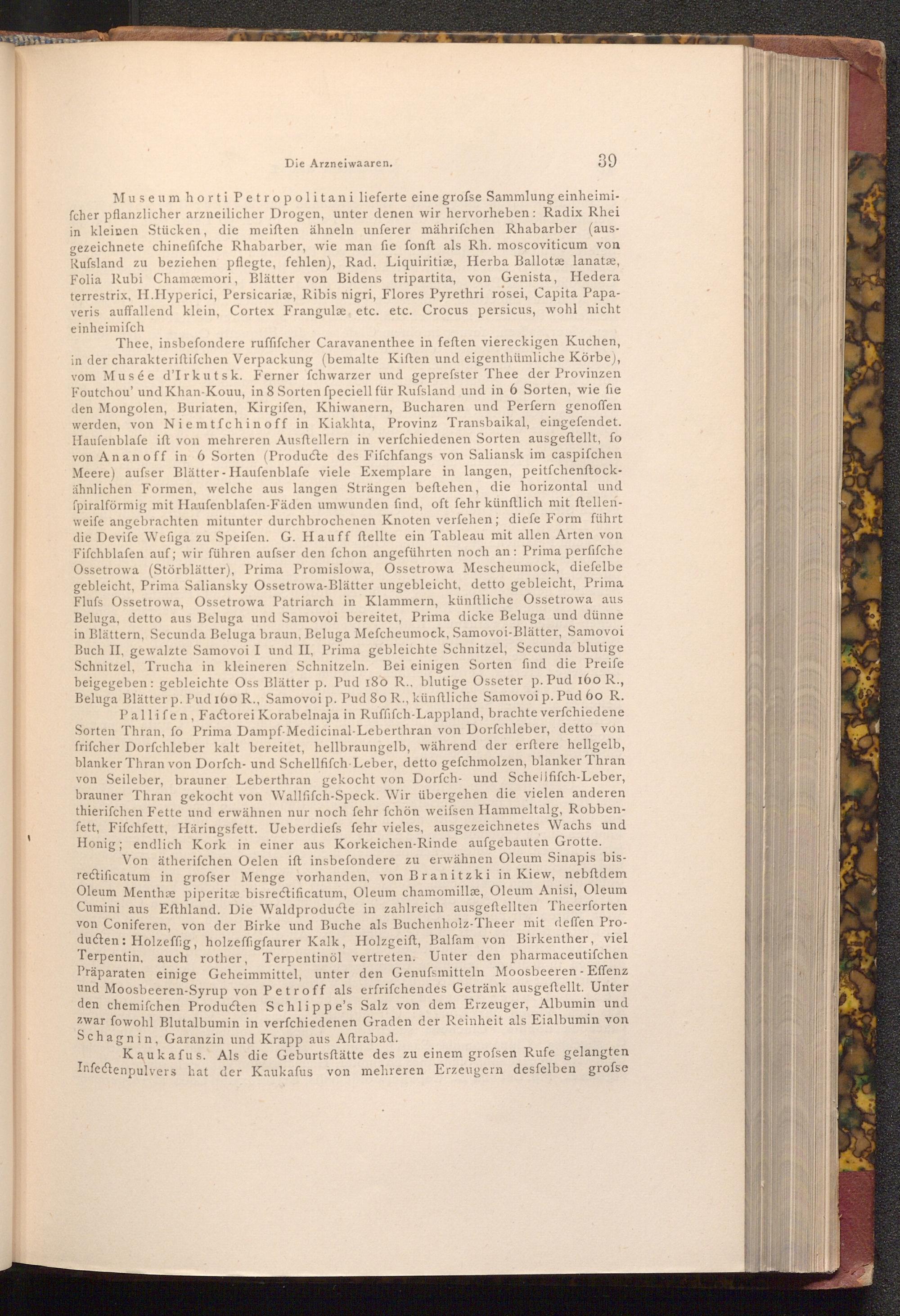 Museum horti Petropolitani lieferte eine grofse Sammlung einheimifcher pflanzlicher arzneilicher Drogen, unter denen wir hervorheben: Radix Rhei in kleinen Stücken, die meiften ähneln unferer mährifchen Rhabarber( ausgezeichnete chinefifche Rhabarber, wie man fie fonft als Rh. moscoviticum von Rufsland zu beziehen pflegte, fehlen), Rad. Liquiritiæ, Herba Ballotæ lanatæ, Folia Rubi Chamæmori, Blätter von Bidens tripartita, von Genista, Hedera terrestrix, H.Hyperici, Persicaria, Ribis nigri, Flores Pyrethri rosei, Capita Papaveris auffallend klein, Cortex Frangulæ etc. etc. Crocus persicus, wohl nicht einheimifch
