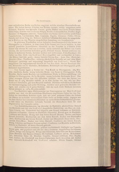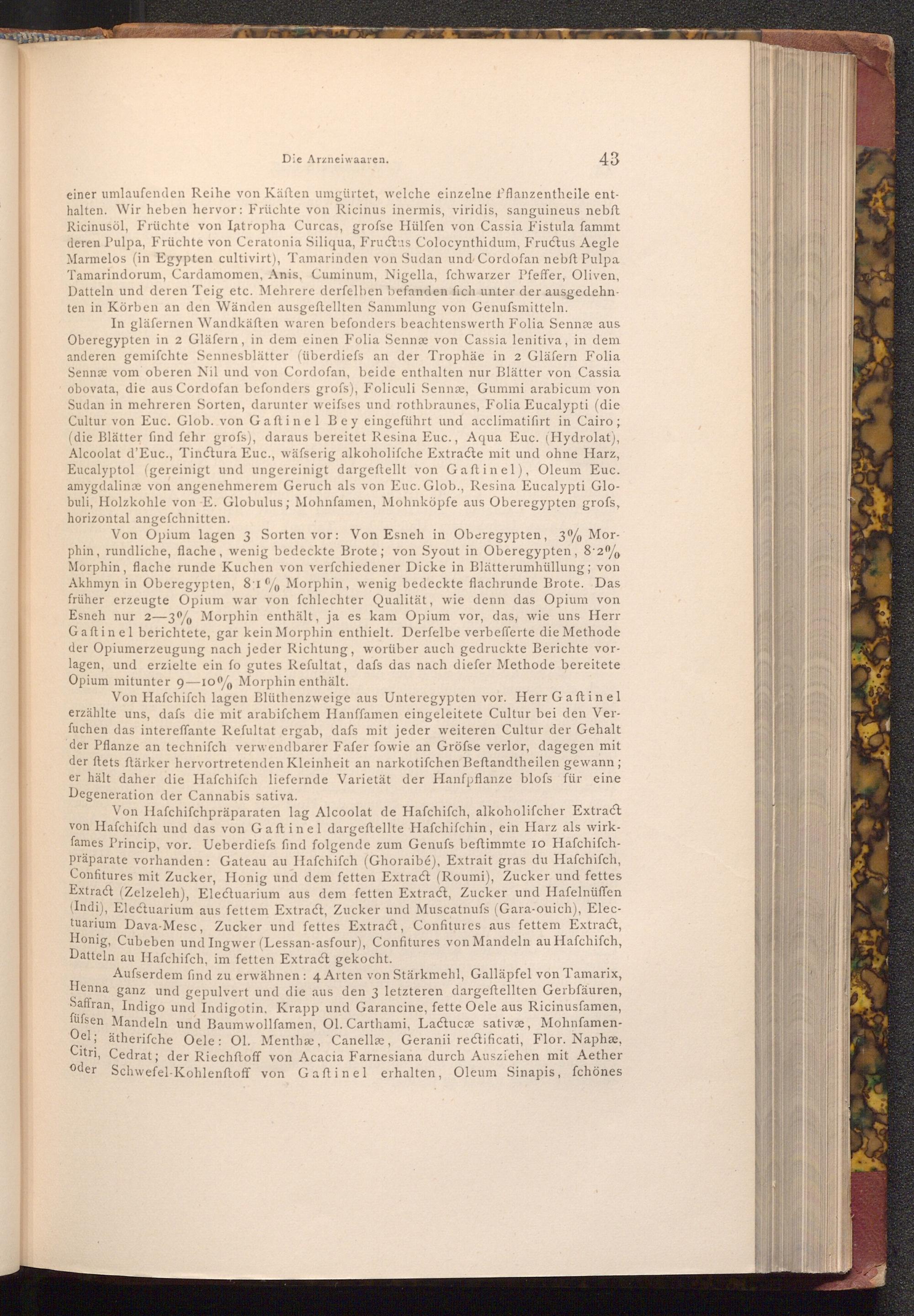Von Opium lagen 3 Sorten vor: Von Esneh in Oberegypten, 3% Morphin, rundliche, flache, wenig bedeckte Brote; von Syout in Oberegypten, 8.2% Morphin, flache runde Kuchen von verfchiedener Dicke in Blätterumhüllung; von Akhmyn in Oberegypten, 81% Morphin, wenig bedeckte flachrunde Brote. Das früher erzeugte Opium war von fchlechter Qualität, wie denn das Opium von Esneh nur 2-3% Morphin enthält, ja es kam Opium vor, das, wie uns Herr Gaftinel berichtete, gar kein Morphin enthielt. Derfelbe verbefferte die Methode der Opiumerzeugung nach jeder Richtung, worüber auch gedruckte Berichte vorlagen, und erzielte ein fo gutes Refultat, dafs das nach diefer Methode bereitete Opium mitunter 9-10% Morphin enthält.