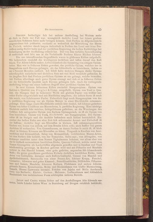 PERSIEN betheiligte fich bei unferer Ausftellung bei Weitem mehr als diefs in Paris der Fall war, wenngleich dasfelbe Land bei feinen grofsen arzneilichen Schätzen hätte mehr bringen können. Dafs Perfien im Allgemeinen fo ausgezeichnet fich präfentirt, verdankt es wefentlich der Mitwirkung des Herrn Dr. Polak, welcher durch langen Aufenthalt in Perfien das Land und feine Production emfig ftudirt hatte und der perfifchen Regierung die beften Rathfchläge bei Betheiligung an der Ausftellung ertheilt hat. Der von ihm verfafste Specialkatalog ift mufterhaft und läfst uns in die Verhältniffe Perfiens klaren Blickes fchauen. Die uns intereffirenden Gegenftände waren in gläfernen Käften aufgeftellt. Wir befprechen zunächft die wichtigeren derfelben und laffen darauf den Reft folgen. Vor Allem feffelte unfere Aufmerkfamkeit die Sammlung von einigen Opiumforten. Man war in früheren Zeiten gewohnt, das perfifche Opium, welches nur in Stangenform nach Europa gelangte, als das fchlechtefte zu bezeichnen, indem es nur I Percent Morphin enthielt. Ich felbft habe mehrere Stangen diefes Opiums mikrofkopifch unterfucht und diefelben ftets mit viel Mehl vermifcht gefunden. In der jüngften Zeit find Proben perfifchen Opiums zu uns gelangt, welche beweifen, dafs Perfien allerdings auch gutes Opium erzeugt und dafs es in früheren Zeiten nur die fchlechtefte Qualität nach Europa gelangen liefs. Auch die vorliegende Ausftellung bringt uns einen befferen Begriff über perfifches Opium bei.
