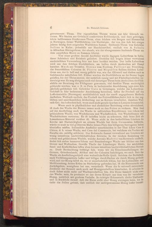 gewonnenen Thran. Die eigentlichen Thrane waren nur fehr fchwach vertreten. Wir fanden aus Grönland confervirten Robbenfpeck, und dazu gehörigen, fchön hellbraunen Dreikronen- Thran, eben folchen von Bergen und Hammerfeſt in Norwegen, ferner Wallfifchthran von Martinique, der von den fich feit einigen Jahren häufig dort zeigenden Wallfifchen ftammt, Seehunds- Thran von Gebrüder Salina in Kafan, jedenfalls nur Handelsartikel, endlich von A. Schultz in Aftrachan Häringsthran, der ebenfo, wie der ebengenannte Seehunds- Thran aus dem caspifchen Meere zu ftammen fcheint.