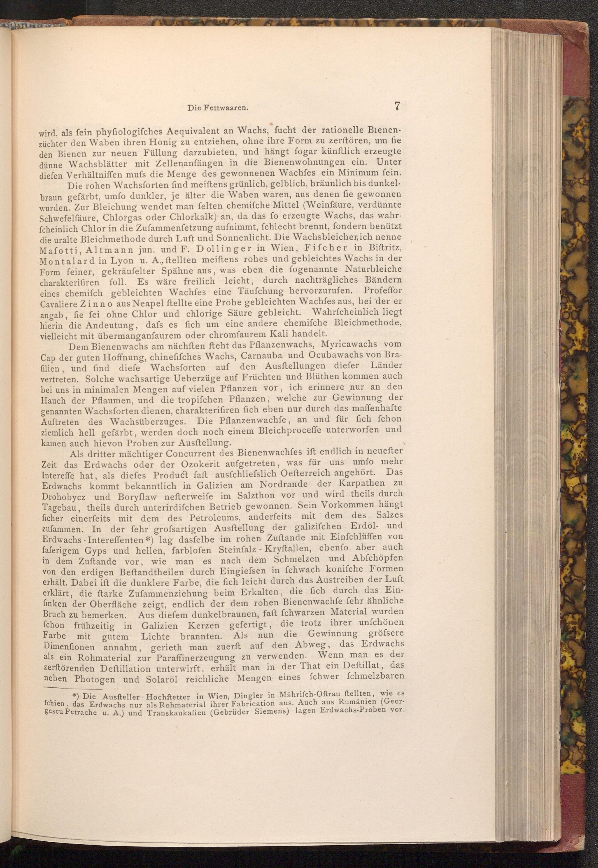 Als dritter mächtiger Concurrent des Bienenwachfes ift endlich in neuefter Zeit das Erdwachs oder der Ozokerit aufgetreten, was für uns umfo mehr Intereffe hat, als diefes Product faft ausfchliefslich Oefterreich angehört. Das Erdwachs kommt bekanntlich in Galizien am Nordrande der Karpathen zu Drohobycz und Boryflaw nefterweife im Salzthon vor und wird theils durch Tagebau, theils durch unterirdifchen Betrieb gewonnen. Sein Vorkommen hängt ficher einerfeits mit dem des Petroleums, anderfeits mit dem des Salzes zufammen. In der fehr grofsartigen Ausftellung der galizifchen Erdöl- und Erdwachs Intereffenten*) lag dasfelbe im rohen Zuftande mit Einfchlüffen von faferigem Gyps und hellen, farblofen Steinfalz- Kryftallen, ebenfo aber auch in dem Zuftande vor, wie man es nach dem Schmelzen und Abfchöpfen von den erdigen Beftandtheilen durch Eingiefsen in fchwach konifche Formen erhält. Dabei ift die dunklere Farbe, die fich leicht durch das Austreiben der Luft erklärt, die ftarke Zufammenziehung beim Erkalten, die fich durch das Einfinken der Oberfläche zeigt, endlich der dem rohen Bienenwachfe fehr ähnliche Bruch zu bemerken. Aus diefem dunkelbraunen, faft fchwarzen Material wurden fchon frühzeitig in Galizien Kerzen gefertigt, die trotz ihrer unfchönen Farbe mit mit gutem Lichte brannten. Als nun die Gewinnung gröfsere Dimenfionen annahm, gerieth man zuerft auf den Abweg, das Erdwachs als ein Rohmaterial zur Paraffinerzeugung zu verwenden. Wenn man es der zerftörenden Deftillation unterwirft, erhält man in der That ein Deftillat, das neben Photogen und Solaröl reichliche Mengen eines fchwer fchmelzbaren