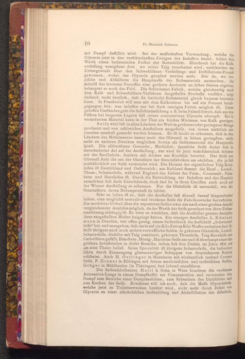 Bei der maffenhaften Verwendung, welche das Glycerin jetzt in den verfchiedenften Zweigen der Induſtrie findet, bildet fein Werth einen bedeutenden Factor der Rentabilität. Hierdurch hat die Kalkverfeifung wenigftens dort, wo reiner Talg verarbeitet wird, entfchieden das Uebergewicht über den Schwefelfäure Verfeifungs und Deftillations- Procefs gewonnen, wobei das Glycerin geopfert werden mufs. Nur da, wo tropifche und Abfallfette die Hauptmaffe des Rohmaterials ausmachen, die mittelft des letzteren Proceffes eine gröfsere Ausbeute an feften Säuren ergeben, behauptet er noch das Feld. Die Schiedamer Fabrik, welche gleichzeitig nach dem Kalk- und Schwefelfäure- Verfahren dargeftellte Producte vorführt, zeigt dadurch recht deutlich, dafs fie beiderlei Rohmaterial gleich bequem beziehen kann. In Frankreich will man mit dem Kalkzufatze bis auf ein Percent herabgegangen fein, was indeffen nur bei ftark ranzigen Fetten möglich ift. Unter gewiffen Umständen geht die Selbftentmifchung z. B. beim Palmöl foweit, dafs aus den Fäffern bei längerem Lagern faft reines concentrirtes Glycerin abtropft. Bei fo verändertem Material kann in der That ein folches Minimum von Kalk genügen. Seife wird faft in allen Ländern der Welt in gröfserer oder geringerer Menge producirt und von zahlreichen Ausftellern ausgeftellt, von denen natürlich nur einzelne namhaft gemacht werden können. Es ift leicht zu erkennen, dafs in den Ländern des Mittelmeeres immer noch das Olivenöl in feinen geringften, nicht mehr zu anderen Zwecken tauglichen Sorten als Seifenmaterial die Hauptrolle fpielt. Die altberühmte Genuefer, Marſeiller, ſpaniſche Seife findet fich in unveränderter Art auf der Ausftellung, nur wird fie jetzt wahrfcheinlich feltener mit der Barillafoda, fondern mit folcher aus Kochfalz bereitet. Der Seife aus Olivenöl fteht die aus der Oleïnfäure der Stearinfabriken am nächften, die ja faft ausfchliesslich zur Seife verwendet wird. Die Heimat der eigentlichen Talg- Kernfeifen ift Deutfchland und Oefterreich; aus Rufsland ftammt die Hanf-, Leinöl., Thran-, Schmierfeife, während England das Gebiet der Palm-, Cocusnufs-, Palmkern- und Harzfeifen ift. Durch die Entwicklung der Induftrie und des Handels vermifchen fich diefe Unterfchiede, doch find fie in ihren Umriffen auch noch auf der Wiener Ausftellung zu erkennen. Nur die Oleïnfeife ift univerfell, wie die Stearinfäure, deren Nebenproduct fie bildet.