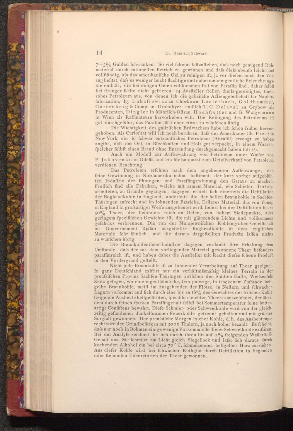 7-534 Gulden fchwanken. So viel fcheint feftzuftehen, dafs noch genügend Rohmaterial durch rationellen Betrieb zu gewinnen und dafs diefs ebenfo leicht und vollſtändig, als das amerikaniſche Oel zu reinigen ift, ja vor diefem noch den Vorzug befitzt, dafs es weniger leicht flüchtige und daher mehr eigentliche Beleuchtungsöle enthält, die bei einigen Oelen vollkommen frei von Paraffin find, daher felbft bei ftrenger Kälte nicht gefrieren. 14 Ausfteller ftellen theils gereinigtes, theils rohes Petroleum aus, von denen ich die galizifche Actiengeſellſchaft für Naphtafabrication, Ig. Lukafiewicz zu Chorkowa, Lauterbach, Goldhammer, Gartenberg& Comp. in Drohobycz, endlich T. G. Delaval zu Grybow als Producenten, Dingler in Mährifch- Oftrau, Hochftetter und G. Wagemann in Wien als Raffinateure hervorheben will. Die Reinigung des Petroleums ift gut durchgeführt, das Paraffin läfst eher etwas zu wünfchen übrig.