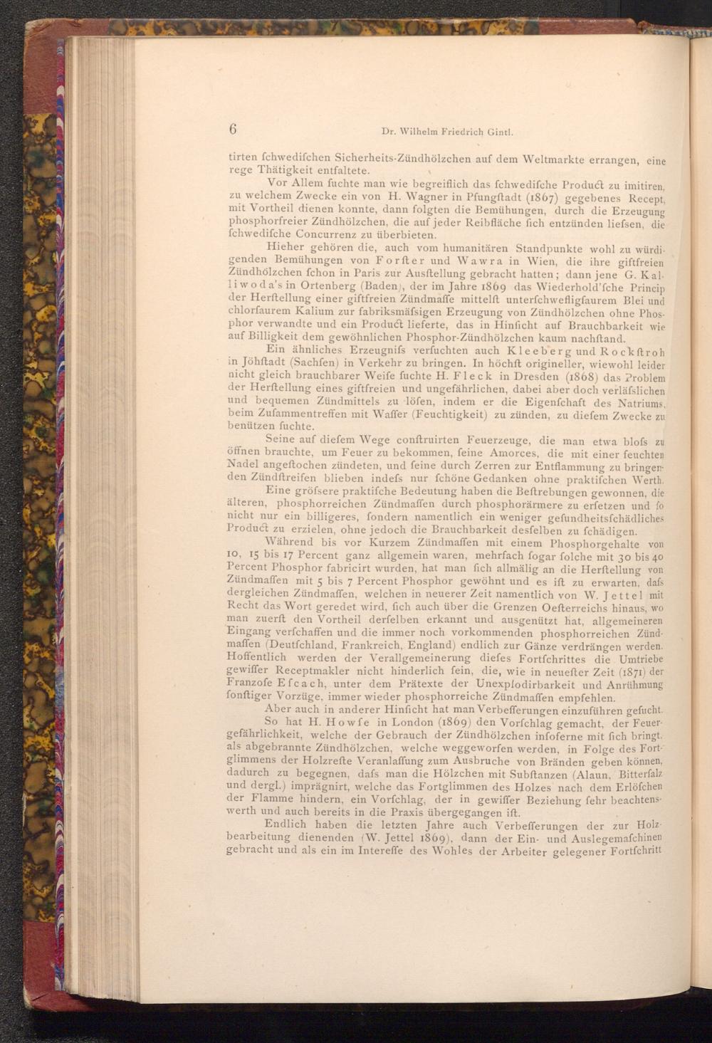 Hieher gehören die, auch vom humanitären Standpunkte wohl zu würdigenden Bemühungen von Forfter und Wawra in Wien, die ihre giftfreien Zündhölzchen fchon in Paris zur Ausftellung gebracht hatten; dann jene G. Kalliwoda's in Ortenberg( Baden), der im Jahre 1869 das Wiederhold'fche Princip der Herftellung einer giftfreien Zündmaffe mittelft unterfchwefligfaurem Blei und chlorfaurem Kalium zur fabriksmäfsigen Erzeugung von Zündhölzchen ohne Phosphor verwandte und ein Product lieferte, das in Hinficht auf Brauchbarkeit wie auf Billigkeit dem gewöhnlichen Phosphor- Zündhölzchen kaum nachftand.