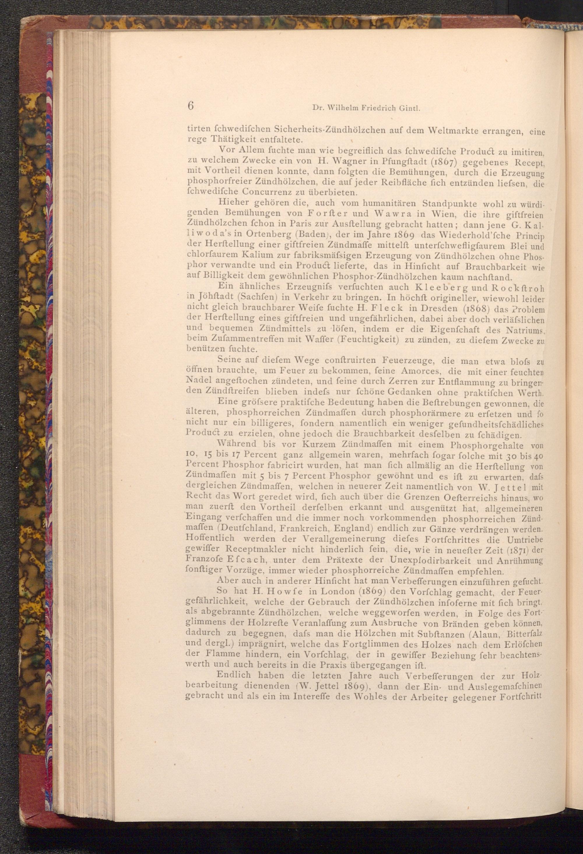 Vor Allem fuchte man wie begreiflich das fchwedifche Product zu imitiren, zu welchem Zwecke ein von H. Wagner in Pfungstadt( 1867) gegebenes Recept, mit Vortheil dienen konnte, dann folgten die Bemühungen, durch die Erzeugung phosphorfreier Zündhölzchen, die auf jeder Reibfläche fich entzünden liefsen, die fchwedifche Concurrenz zu überbieten.