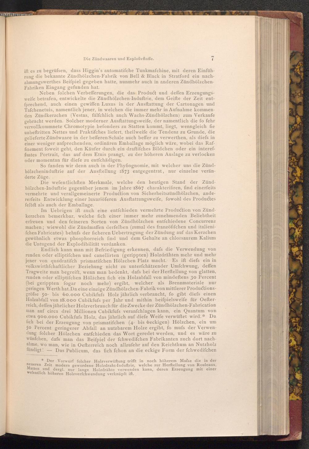 Endlich kann man mit Befriedigung erkennen, dafs die Verwendung von runden oder elliptifchen und canellirten( gerippten) Holzdrähten mehr und mehr jener von quadratifch prismatifchen Hölzchen Platz macht. Es ift diefs ein in volkswirthfchaftlicher Beziehung nicht zu unterfchätzender Umfchwung, deffen Tragweite man begreift, wenn man bedenkt, dafs bei der Herftellung von glatten, runden oder elliptifchen Hölzchen fich ein Holzabfall von mindeſtens 30 Percent ( bei gerippten fogar noch mehr) ergibt, welcher als Brennmateriale nur geringen Werth hat. Da eine einzige Zündhölzchen- Fabrik von mittlerer Productionsgröfse 50- bis 60.000 Cubikfufs Holz jährlich verbraucht, fo gibt diefs einen Holzabfall von 18.000 Cubikfufs per Jahr und mithin beispielsweife für Oefterreich, deffen jährlicher Holzverbrauch für die Zwecke der Zündhölzchen- Fabrication man auf circa drei Millionen Cubikfufs veranfchlagen kann, ein Quantum von etwa 900.000 Cubikfufs Holz, das jährlich auf diefe Weife verwüftet wird:* Da fich bei der Erzeugung von prismatifchen( 4- bis 6eckigen) Hölzchen, ein um 50 Percent geringerer Abfall an nutzbarem Holze ergibt, fo mufs der Verwendung folcher Hölzchen entfchieden das Wort geredet werden, und es wäre zu wünſchen, dafs man das Beiſpiel der fchwedifchen Fabrikanten auch dort nachahme, wo man, wie in Oefterreich noch allzufehr auf den Reichthum an Nutzholz fündigt! Das Publicum, das fich fchon an die eckige Form der fchwedifchen
