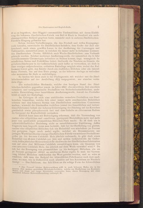 Die wefentlichften Merkmale, welche den heutigen Stand der Zündhölzchen- Induftrie gegenüber jenem im Jahre 1867 charakterifiren, find einerfeits vermehrte und verallgemeinerte Production von Sicherheitszündhölzchen, andererfeits Entwicklung einer luxuriöferen Ausftattungsweife, fowohl des Productes felbft als auch der Emballage.