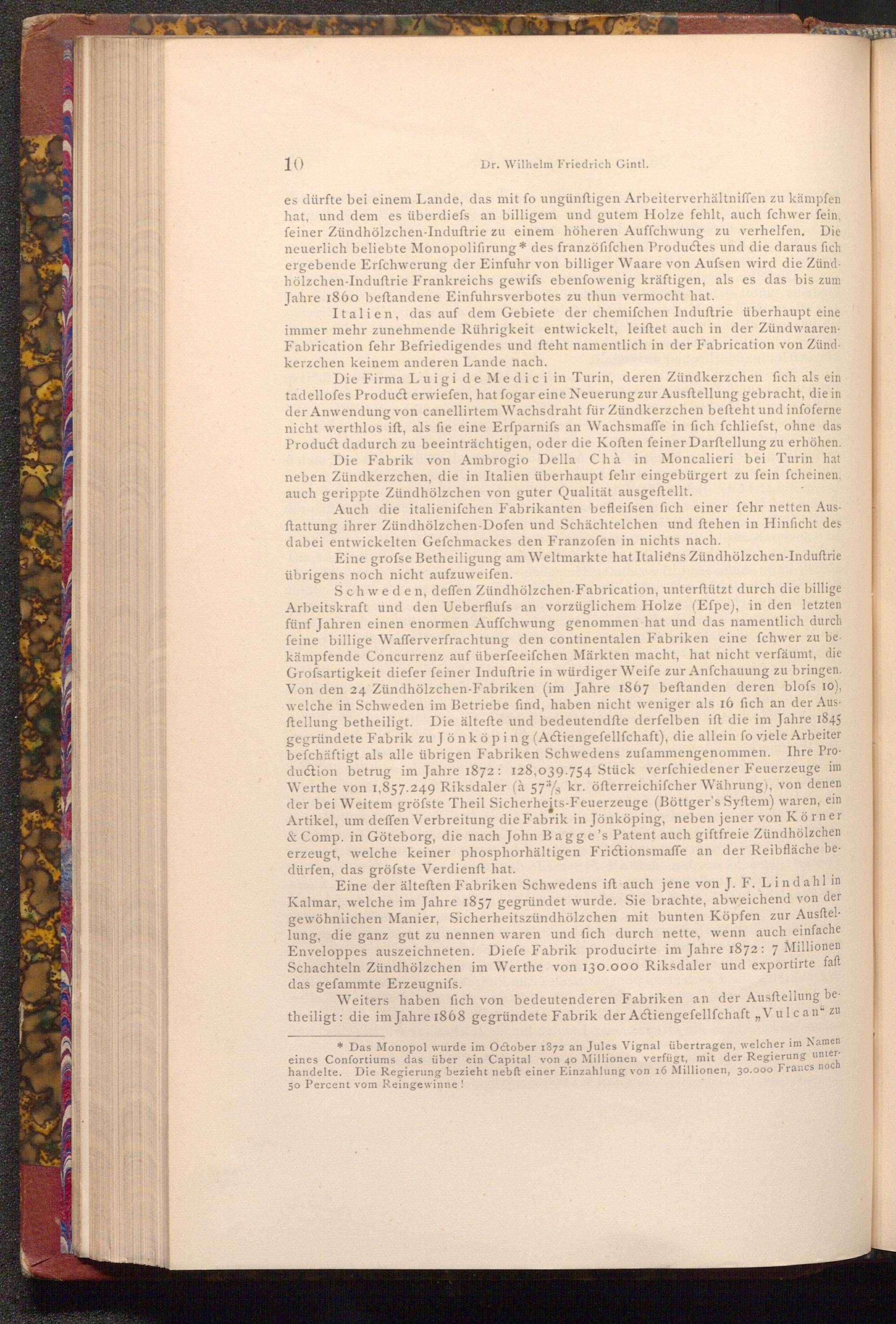 es dürfte bei einem Lande, das mit fo ungünftigen Arbeiterverhältniffen zu kämpfen hat, und dem es überdiefs an billigem und gutem Holze fehlt, auch fchwer fein, feiner Zündhölzchen- Induftrie zu einem höheren Auffchwung zu verhelfen. Die neuerlich beliebte Monopolifirung* des franzöfifchen Productes und die daraus fich ergebende Erfchwerung der Einfuhr von billiger Waare von Aufsen wird die Zündhölzchen- Induftrie Frankreichs gewifs ebenfowenig kräftigen, als es das bis zum Jahre 1860 beftandene Einfuhrsverbotes zu thun vermocht hat.