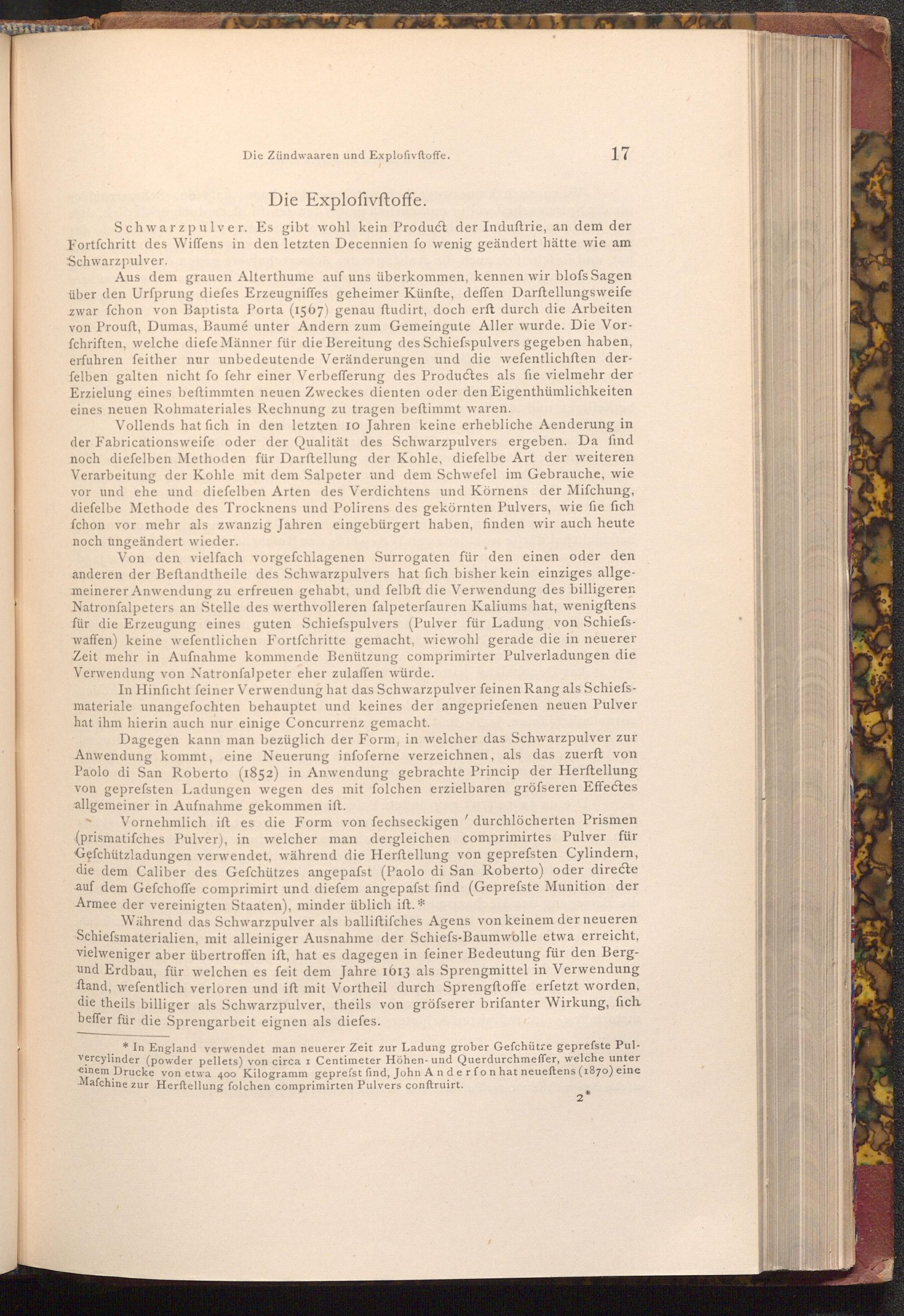Aus dem grauen Alterthume auf uns überkommen, kennen wir blofs Sagen über den Ursprung diefes Erzeugniffes geheimer Künfte, deffen Darftellungsweife zwar fchon von Baptista Porta( 1567) genau ftudirt, doch erft durch die Arbeiten von Prouft, Dumas, Baumé unter Andern zum Gemeingute Aller wurde. Die Vorfchriften, welche diefe Männer für die Bereitung des Schiefspulvers gegeben haben, erfuhren feither nur unbedeutende Veränderungen und die wefentlichften derfelben galten nicht fo fehr einer Verbefferung des Productes als fie vielmehr der Erzielung eines beftimmten neuen Zweckes dienten oder den Eigenthümlichkeiten eines neuen Rohmateriales Rechnung zu tragen beftimmt waren.