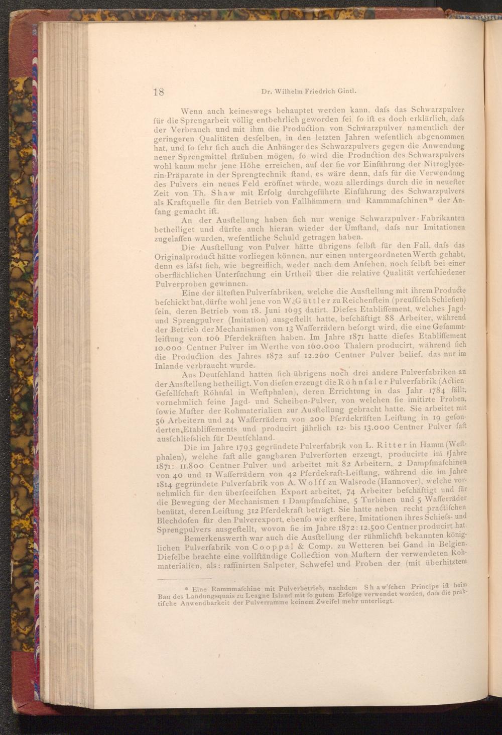 Eine der älteften Pulverfabriken, welche die Ausftellung mit ihrem Producte befchickt hat, dürfte wohl jene von W.Güttler zu Reichenftein( preuffifch Schlefien) fein, deren Betrieb vom 18. Juni 1695 datirt. Diefes Etabliffement, welches Jagdund Sprengpulver( Imitation) ausgeftellt hatte, befchäftigt 88 Arbeiter, während der Betrieb der Mechanismen von 13 Wafferrädern beforgt wird, die eine Gefammtleiftung von 106 Pferdekräften haben. Im Jahre 1871 hatte diefes Etabliffement 10.000 Centner Pulver im Werthe von 160.000 Thalern producirt, während fich die Production des Jahres 1872 auf 12.260 Centner Pulver belief, das nur im Inlande verbraucht wurde.