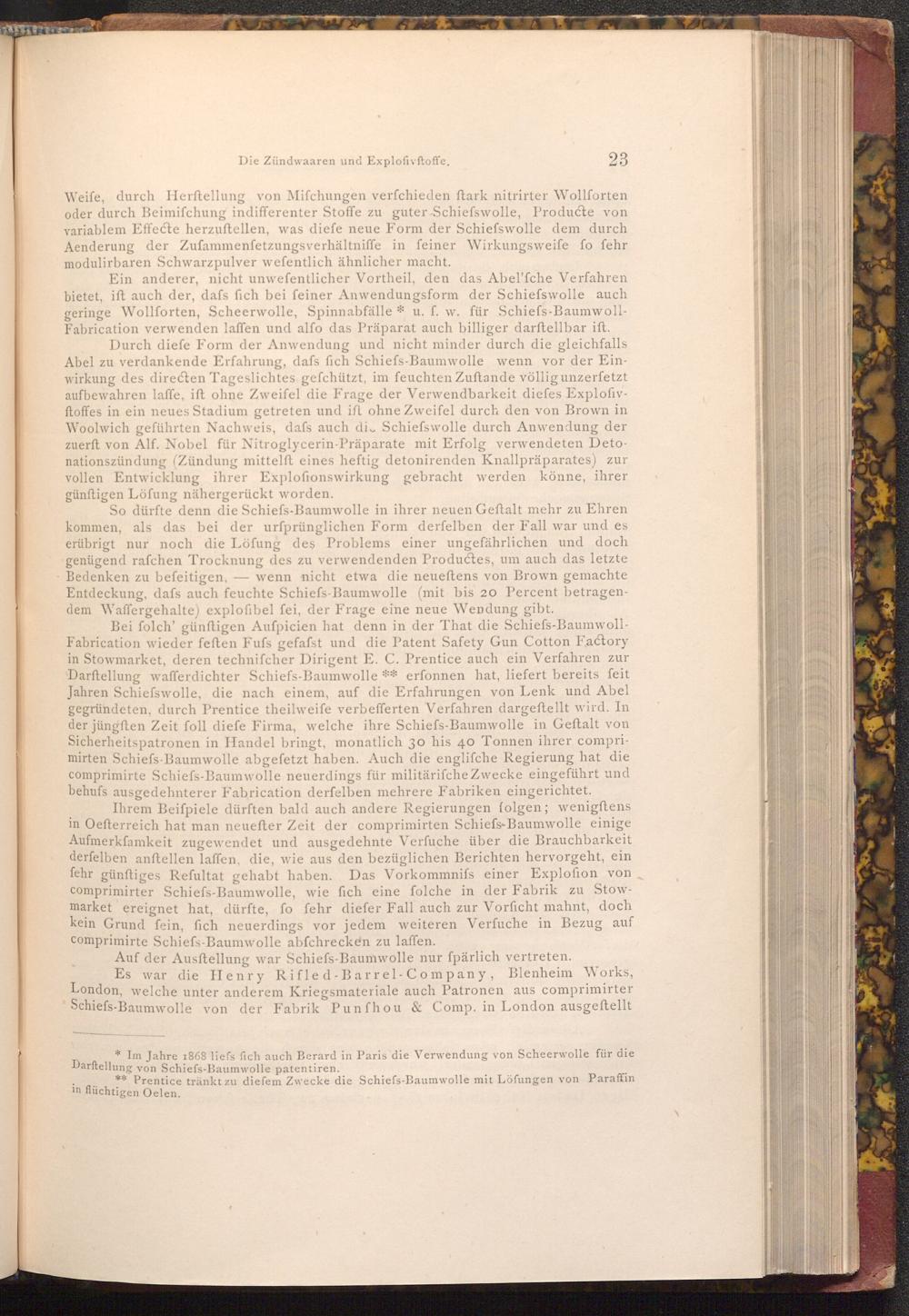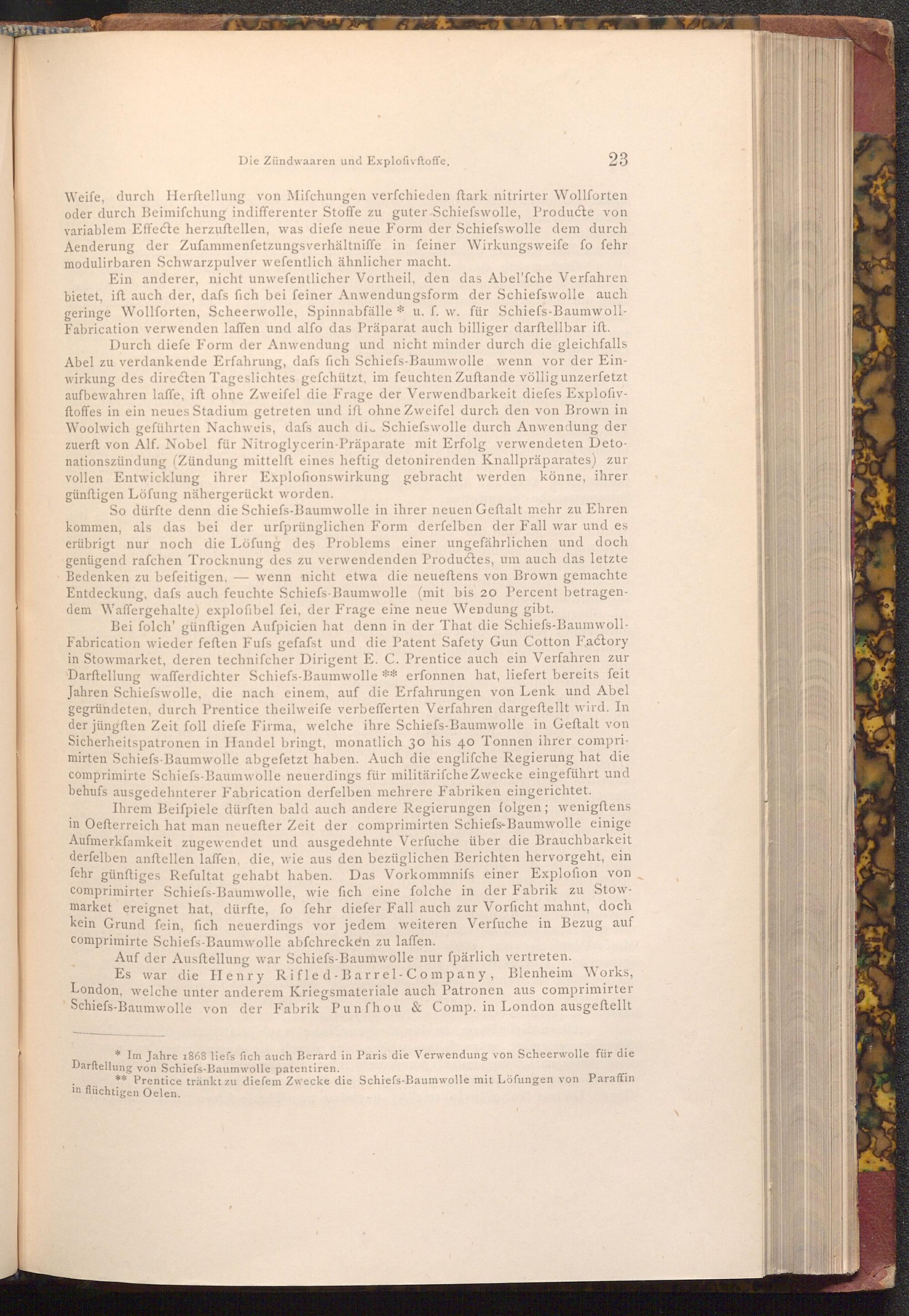 Es war die Henry Rifled- Barrel- Company, Blenheim Works, London, welche unter anderem Kriegsmateriale auch Patronen aus comprimirter Schiefs- Baumwolle von der Fabrik Punfhou& Comp. in London ausgeftellt