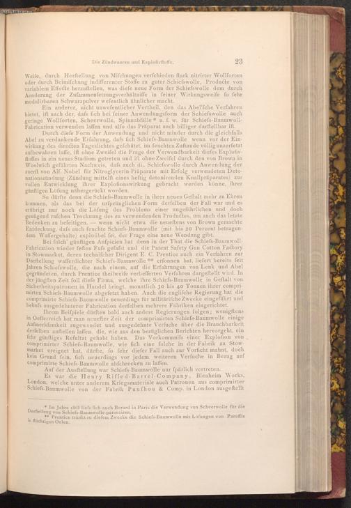 Durch diefe Form der Anwendung und nicht minder durch die gleichfalls Abel zu verdankende Erfahrung, dafs fich Schiefs- Baumwolle wenn vor der Einwirkung des directen Tageslichtes gefchützt, im feuchten Zuftande völlig unzerfetzt aufbewahren laffe, ift ohne Zweifel die Frage der Verwendbarkeit diefes Exploſivftoffes in ein neues Stadium getreten und ist ohne Zweifel durch den von Brown in Woolwich geführten Nachweis, dafs auch die Schiefswolle durch Anwendung der zuerft von Alf. Nobel für Nitroglycerin- Präparate mit Erfolg verwendeten Detonationszündung( Zündung mittelft eines heftig detonirenden Knallpräparates) zur vollen Entwicklung ihrer Explofionswirkung gebracht werden könne, ihrer günftigen Löfung nähergerückt worden.