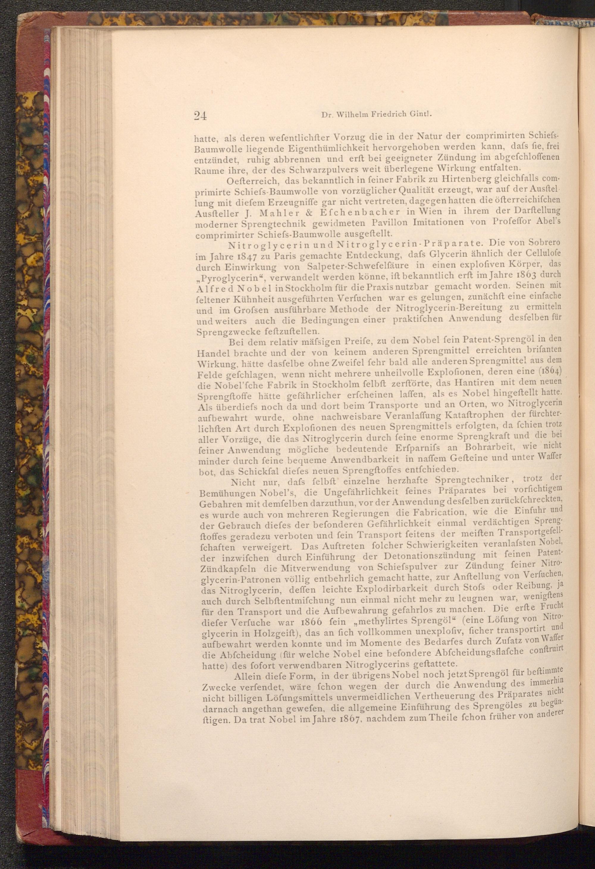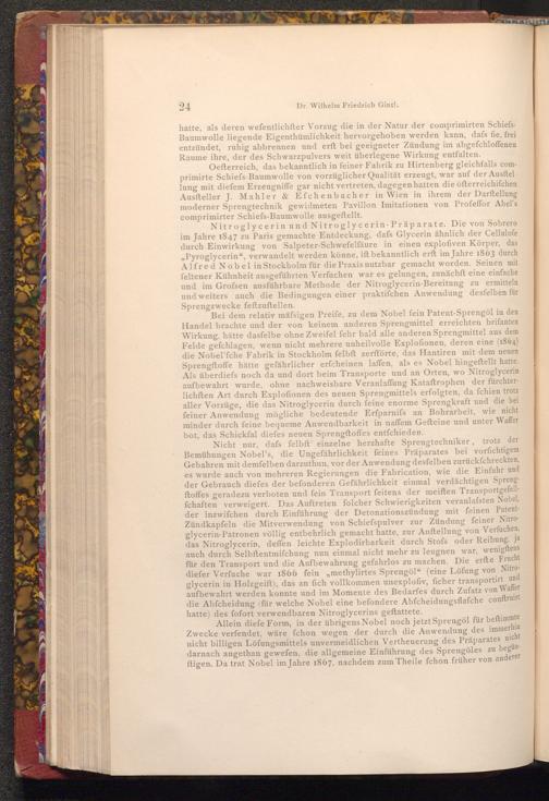 Allein diefe Form, in der übrigens Nobel noch jetzt Sprengöl für beftimmte Zwecke verfendet, wäre fchon wegen der durch die Anwendung des immerhin nicht billigen Löfungsmittels unvermeidlichen Vertheuerung des Präparates nicht zu begündarnach angethan gewefen, die allgemeine Einführung des Sprengöles ftigen. Da trat Nobel im Jahre 1867, nachdem zum Theile fchon früher von anderer