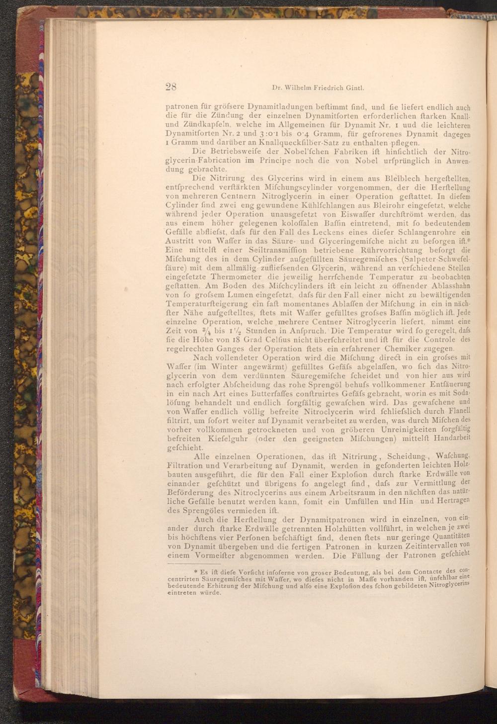 * Es iſt diefe Vorficht infoferne von groser Bedeutung, als bei dem Contacte des concentrirten Säuregemifches mit Waffer, wo diefes nicht in Maffe vorhanden ist, unfehlbar eine bedeutende Erhitzung der Mifchung und alfo eine Explofion des fchon gebildeten Nitroglycerins