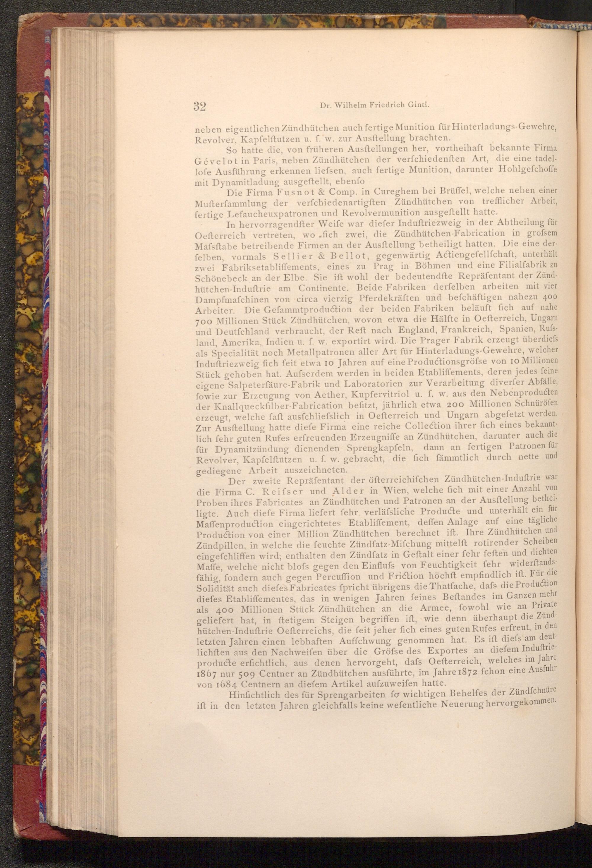 In hervorragendfter Weife war diefer Induftriezweig in der Abtheilung für Oefterreich vertreten, wo.fich zwei, die Zündhütchen- Fabrication in grofsem Mafsftabe betreibende Firmen an der Ausftellung betheiligt hatten. Die eine derfelben, vormals Sellier& Bellot, gegenwärtig Actiengefellfchaft, unterhält zwei Fabriksetabliffements, eines zu Prag in Böhmen und eine Filialfabrik zu Schönebeck an der Elbe. Sie ift wohl der bedeutendfte Repräfentant der Zündhütchen- Induftrie am Continente. Beide Fabriken derfelben arbeiten mit vier Dampfmafchinen von circa vierzig Pferdekräften und befchäftigen nahezu 400 Arbeiter. Die Gefammtproduction der beiden Fabriken beläuft fich auf nahe 700 Millionen Stück Zündhütchen, wovon etwa die Hälfte in Oefterreich, Ungarn und Deutfchland verbraucht, der Reft nach England, Frankreich, Spanien, Rufsland, Amerika, Indien u. f. w. exportirt wird. Die Prager Fabrik erzeugt überdiefs als Specialität noch Metallpatronen aller Art für Hinterladungs- Gewehre, welcher Induftriezweig fich feit etwa 10 Jahren auf eine Productionsgröfse von 10 Millionen Stück gehoben hat. Ausserdem werden in beiden Etabliffements, deren jedes feine eigene Salpeterfäure- Fabrik und Laboratorien zur Verarbeitung diverfer Abfälle, fowie zur Erzeugung von Aether, Kupfervitriol u. f. w. aus den Nebenproducten der Knallqueckfilber- Fabrication befitzt, jährlich etwa 200 Millionen Schnüröfen erzeugt, welche faft ausfchliefslich in Oefterreich und Ungarn abgefetzt werden. Zur Ausftellung hatte diefe Firma eine reiche Collection ihrer fich eines bekanntlich fehr guten Rufes erfreuenden Erzeugniffe an Zündhütchen, darunter auch die für Dynamitzündung dienenden Sprengkapfeln, dann an fertigen Patronen für Revolver, Kapfelftützen u. f. w. gebracht, die fich fämmtlich durch nette und gediegene Arbeit auszeichneten.