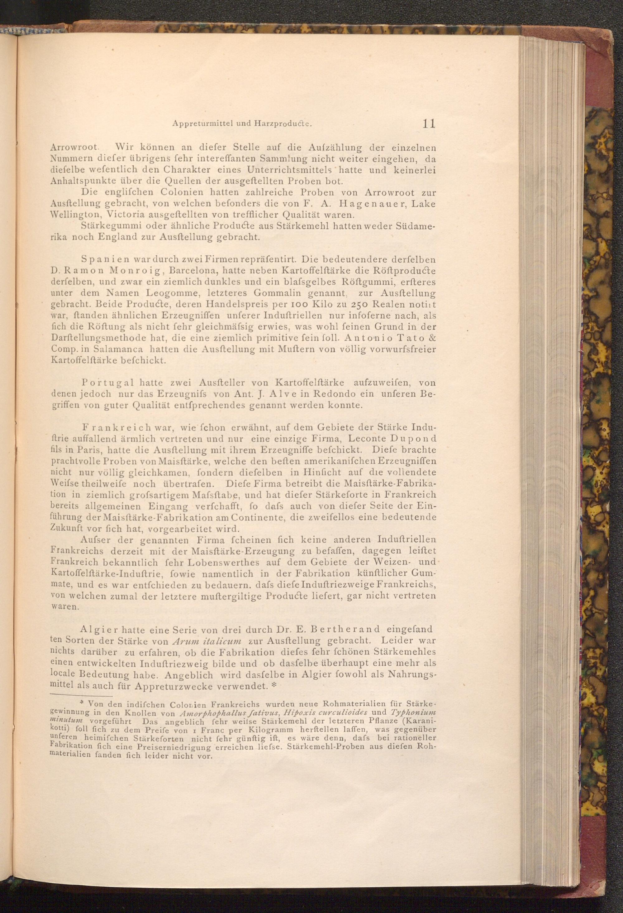 Algier hatte eine Serie von drei durch Dr. E. Berther and eingefand ten Sorten der Stärke von Arum italicum zur Ausftellung gebracht. Leider war nichts darüber zu erfahren, ob die Fabrikation diefes fehr fchönen Stärkemehles einen entwickelten Induftriezweig bilde und ob dasfelbe überhaupt eine mehr als locale Bedeutung habe. Angeblich wird dasfelbe in Algier fowohl als Nahrungsmittel als auch für Appreturzwecke verwendet.*